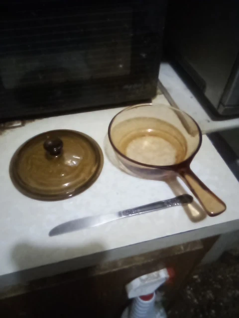 Selling a vintage Vision amber glass cookware set. It includes a saucepan and a lid. This cookware is known for its durability and unique design!