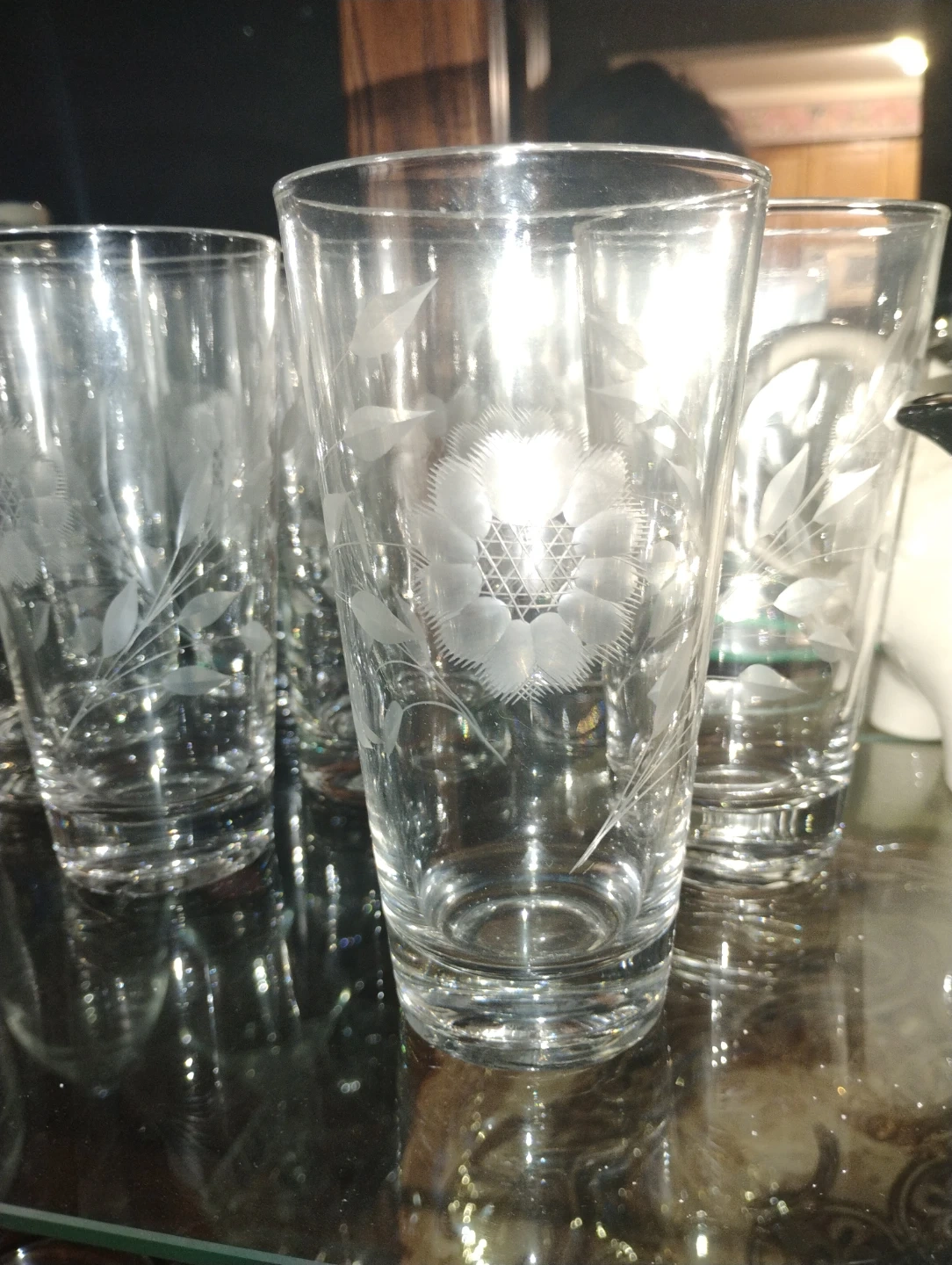 Set of drinking glasses with a delicate etched floral design. They're in great condition and would add a touch of elegance to any table setting!