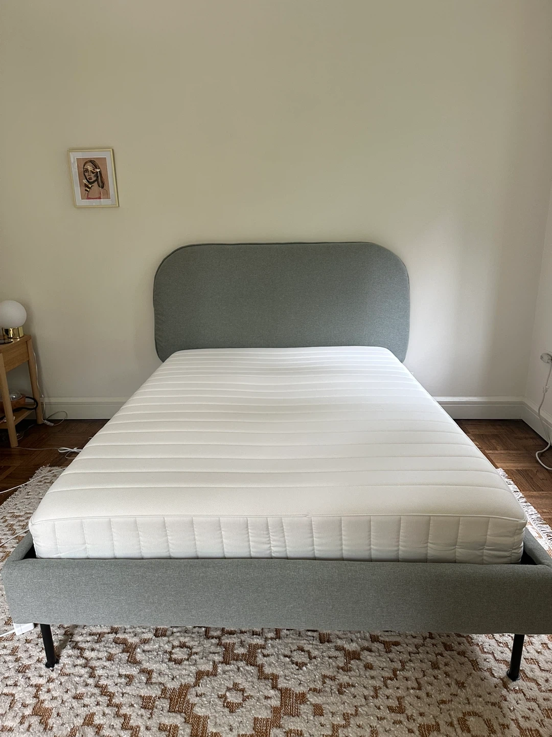 Selling a full size bed frame in gray. It's in good condition and ready for a new mattress. The bed frame has a simple, modern design that would fit well in any bedroom. Let me know if you have any questions!