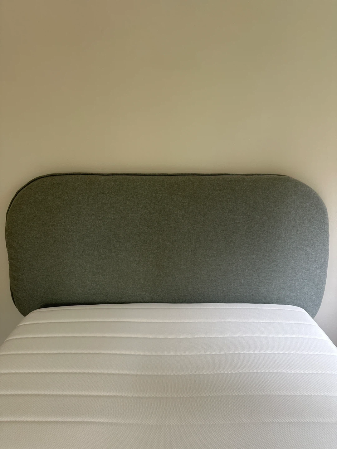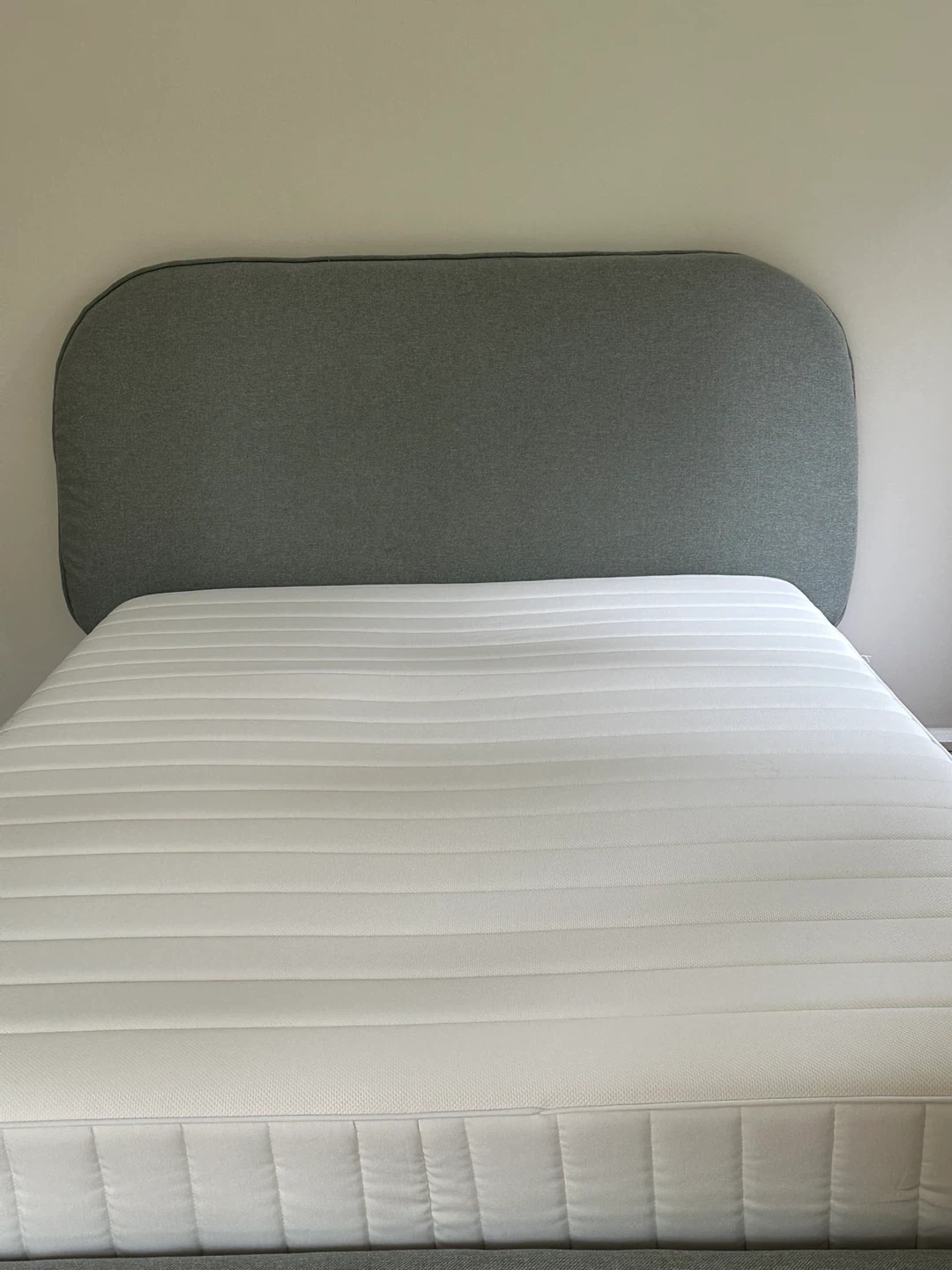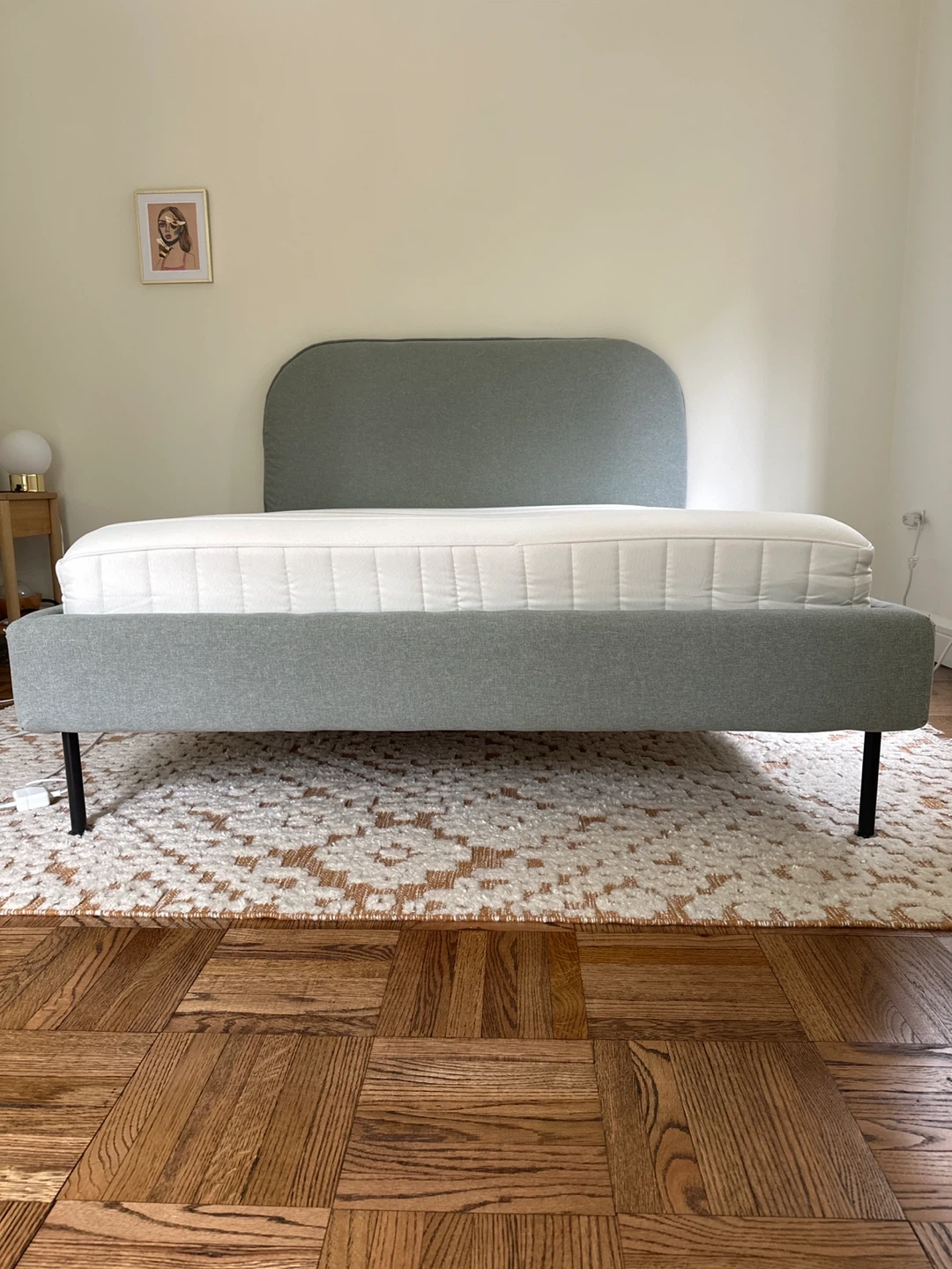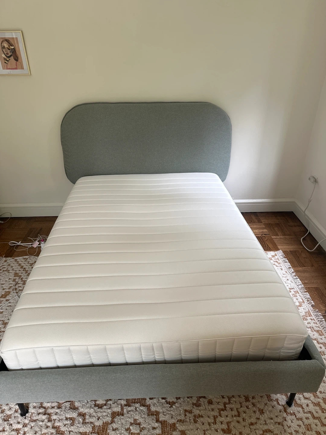 Selling a full size bed frame in gray. It's in good condition and ready for a new mattress. The bed frame has a simple, modern design that would fit well in any bedroom. Let me know if you have any questions!