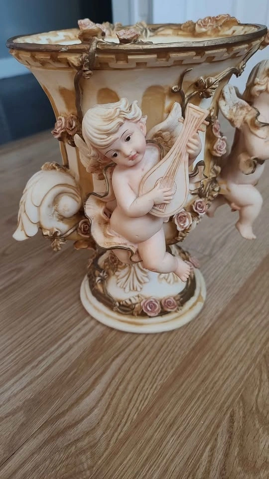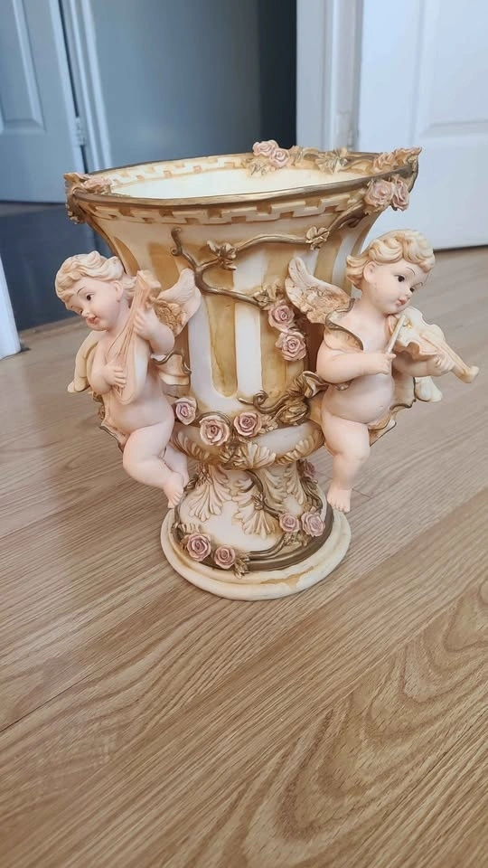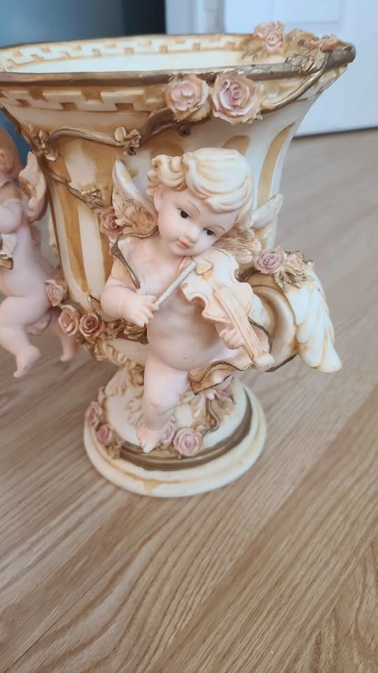 Decorative vase with two musical angels and pink roses.