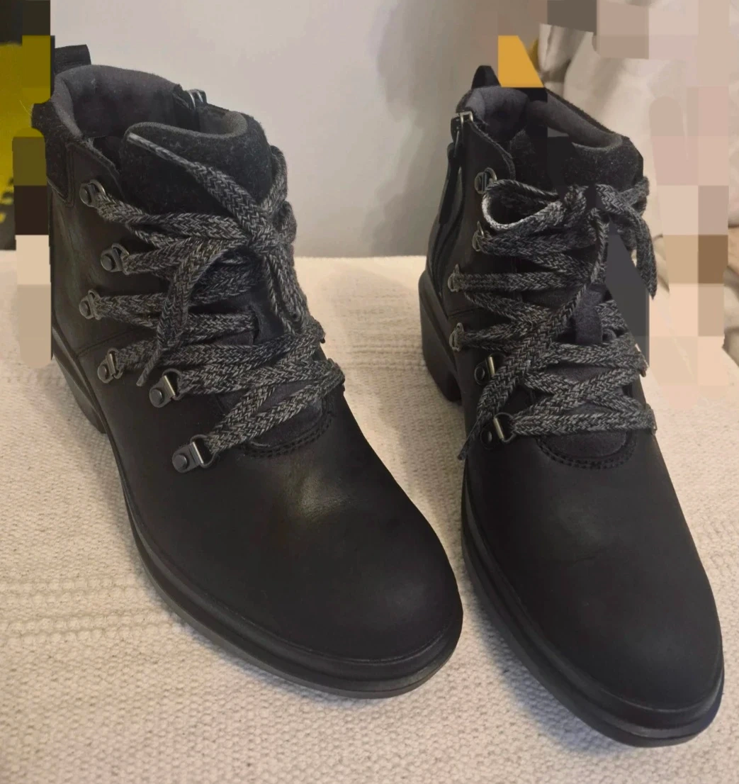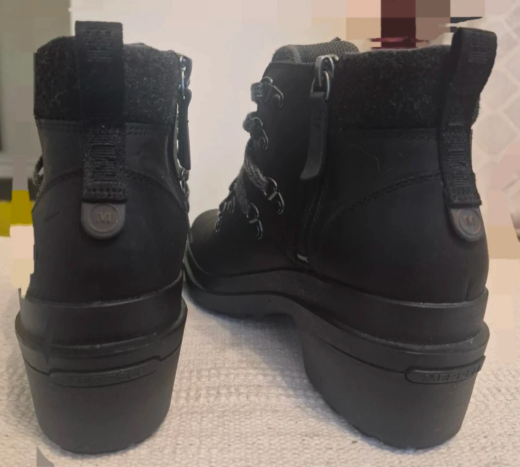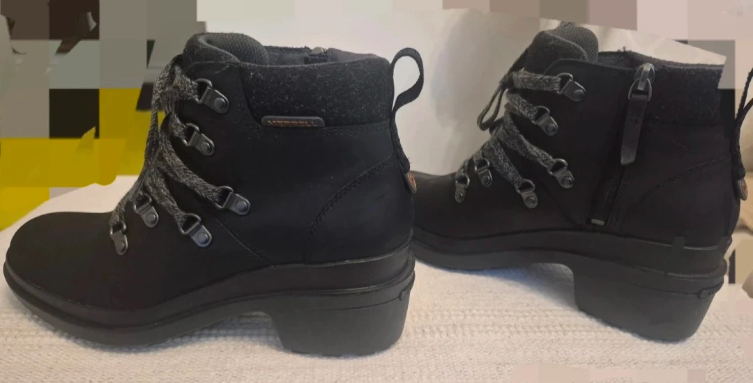 Selling a pair of Merrell black leather ankle boots. They are in great condition and ready for a new owner! They feature a comfortable heel and stylish design, perfect for everyday wear.