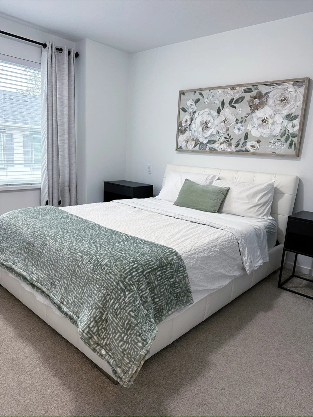 Selling a queen size bed frame featuring a stylish white upholstered headboard. The bed frame is in great condition and would be a lovely addition to any bedroom. If you're looking for a comfy and chic bed frame, this could be the perfect fit!