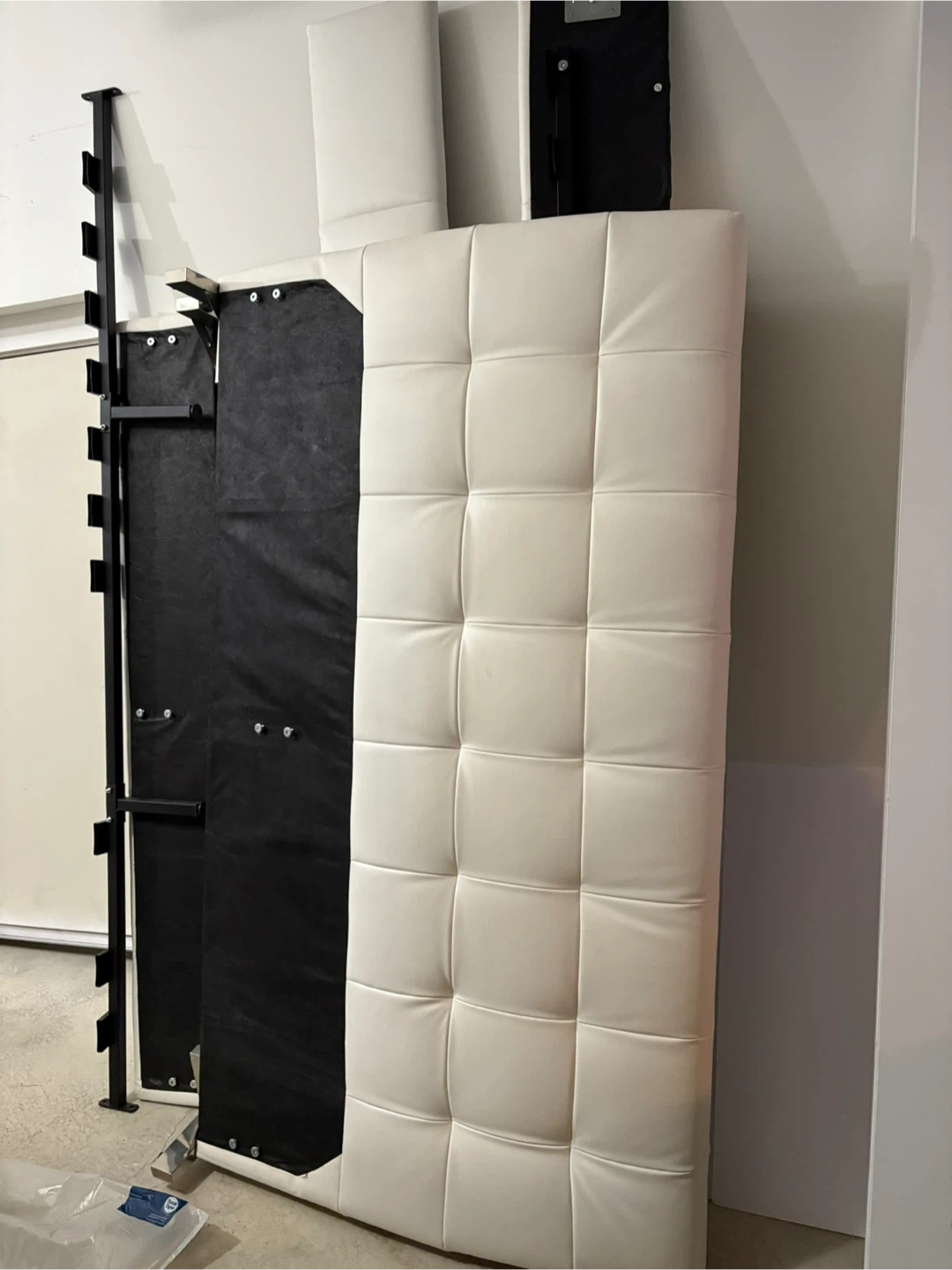 Selling a queen size bed frame featuring a stylish white upholstered headboard. The bed frame is in great condition and would be a lovely addition to any bedroom. If you're looking for a comfy and chic bed frame, this could be the perfect fit!