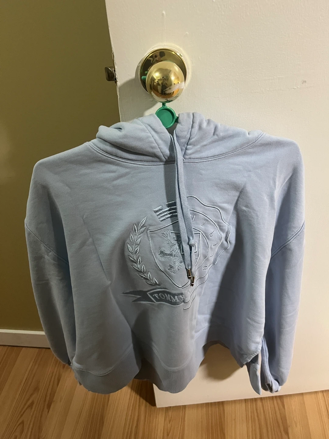 Tommy Hilfiger hoodie in a light blue colour! It's a size medium and in great condition. Perfect for layering or just lounging around