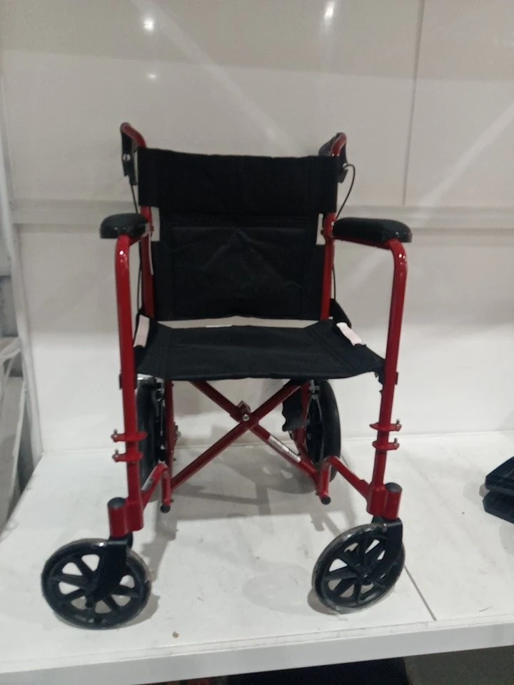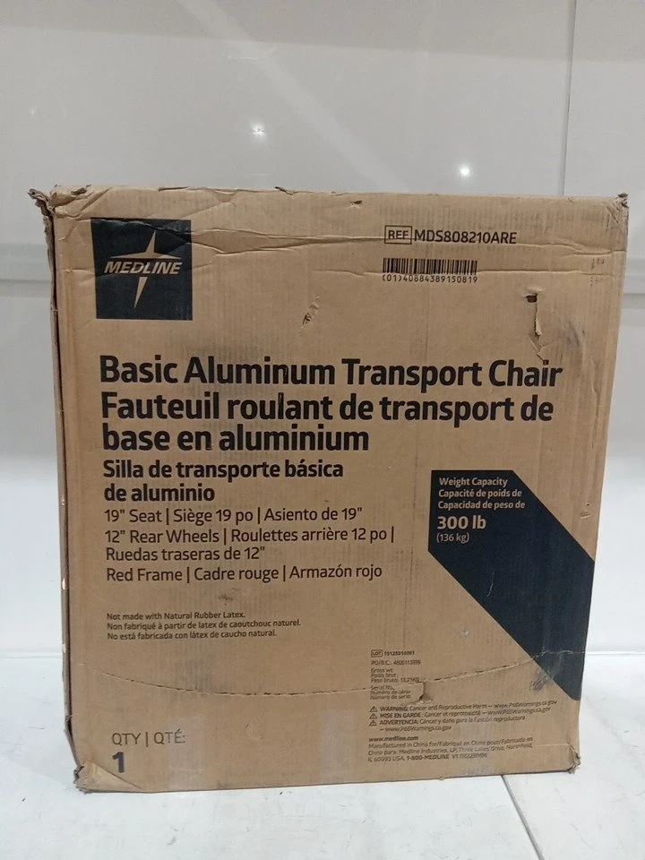 This Medline Basic Aluminum Transport Wheelchair features a 19" seat and 12" rear wheels, making it easy to maneuver, while supporting up to 300 lbs. This wheelchair is in its original box.