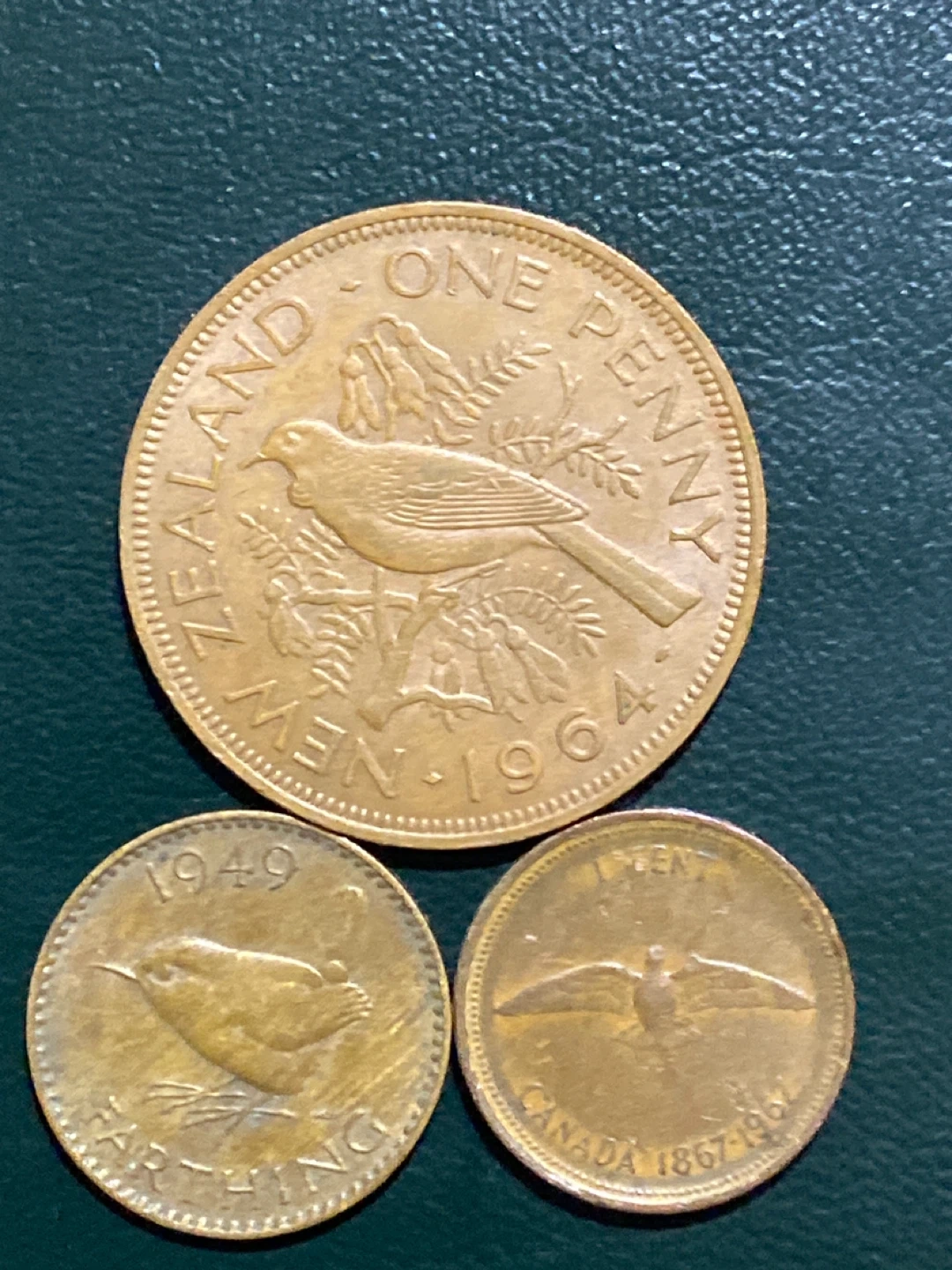 Selling a collection of vintage coins. Includes coins from New Zealand, Canada, and the UK. The New Zealand coin is dated 1964. The Canadian coin is dated 1867-1967. One of the UK coins is dated 1949. Great for collectors!
