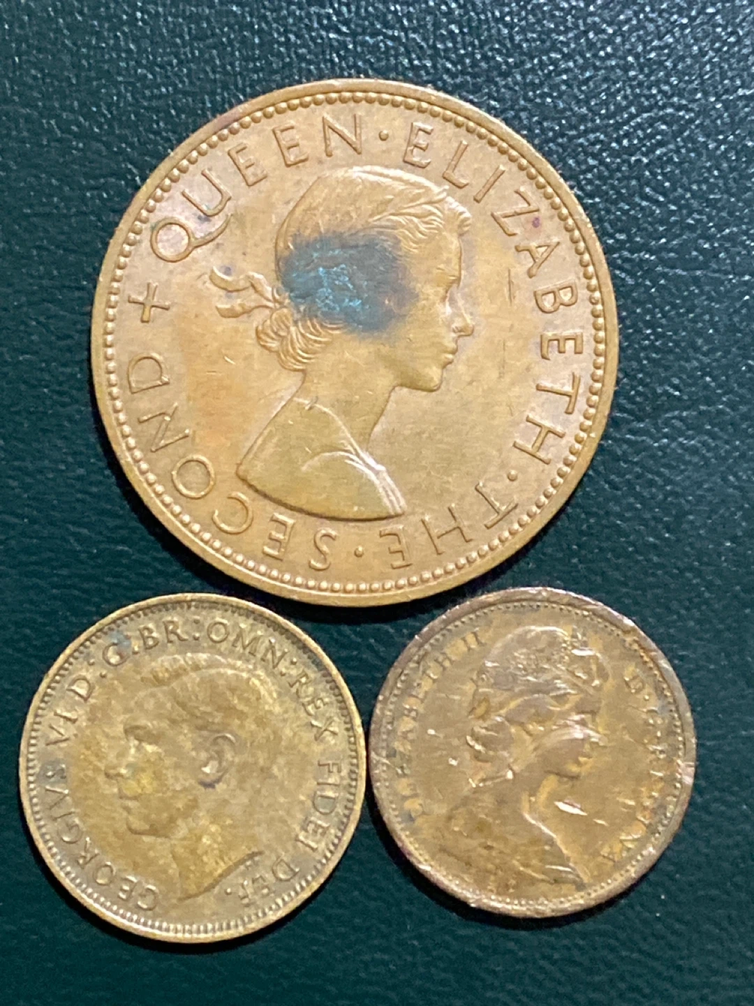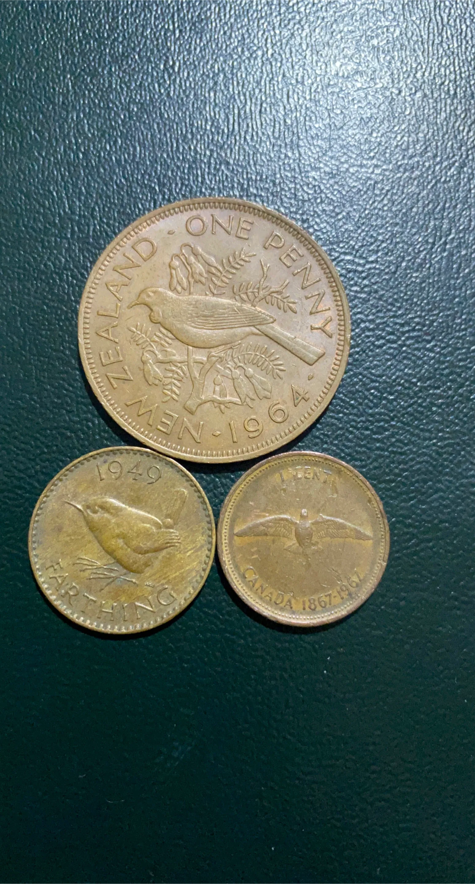 Selling a collection of vintage coins. Includes coins from New Zealand, Canada, and the UK. The New Zealand coin is dated 1964. The Canadian coin is dated 1867-1967. One of the UK coins is dated 1949. Great for collectors!