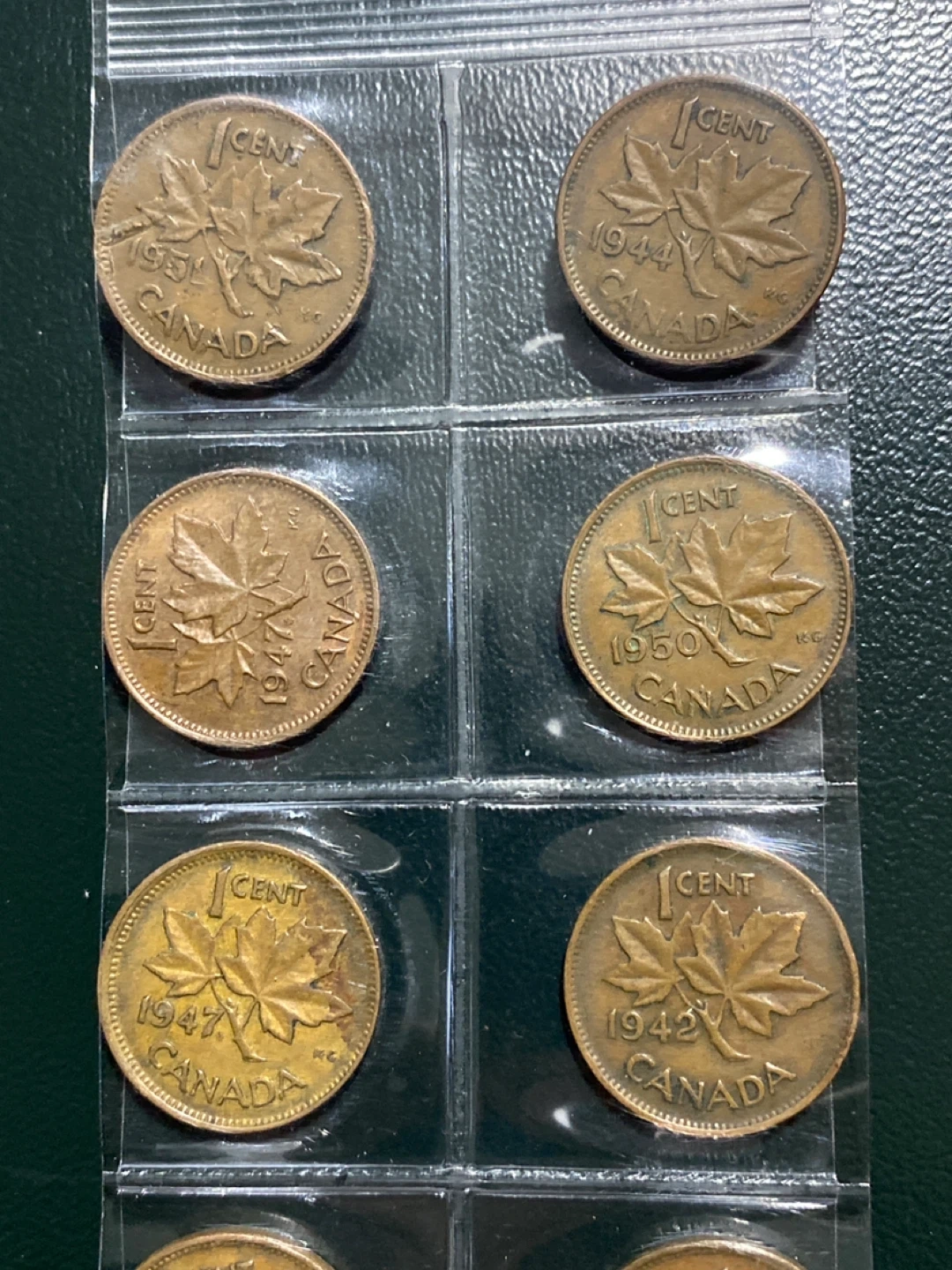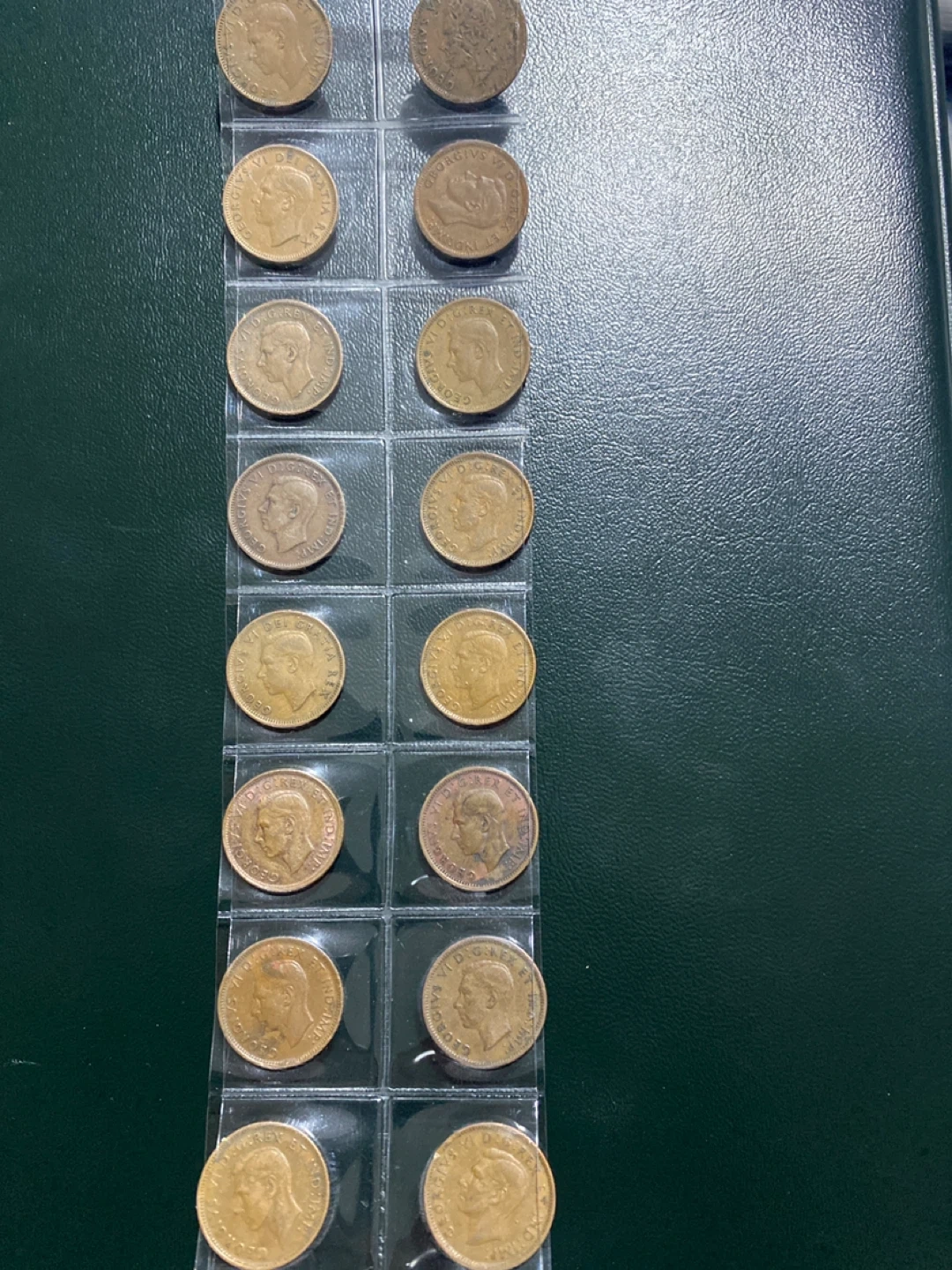 Selling a collection of vintage Canadian pennies. These coins feature King George VI and the classic maple leaf design. Dates range from the 1930s to the 1950s. A great addition to any coin collection!