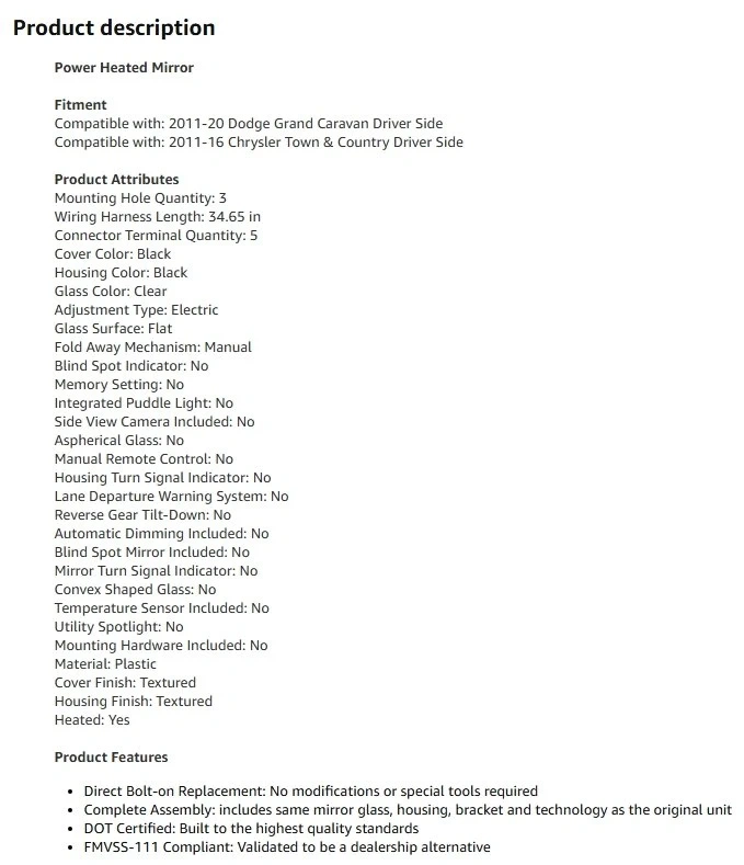 I'm selling a new TRQ driver's side power heated manual folding mirror, textured in black, compatible with 2011-2016 Chrysler Town & Country and 2011-2020 Dodge Grand Caravan. This mirror has never been installed and is ready to provide enhanced visibility and safety for your vehicle.