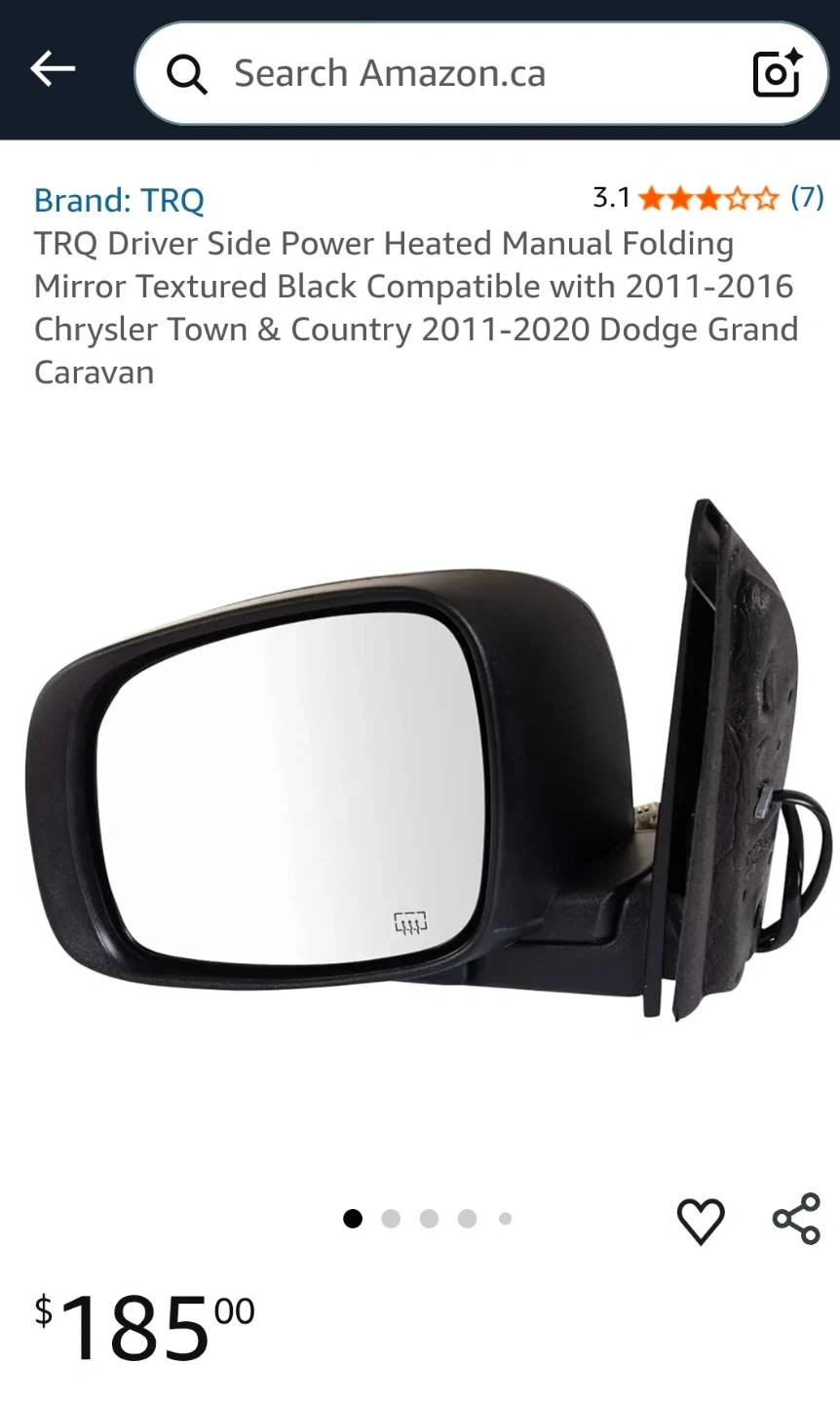 I'm selling a new TRQ driver's side power heated manual folding mirror, textured in black, compatible with 2011-2016 Chrysler Town & Country and 2011-2020 Dodge Grand Caravan. This mirror has never been installed and is ready to provide enhanced visibility and safety for your vehicle.