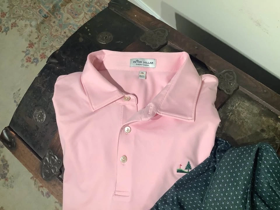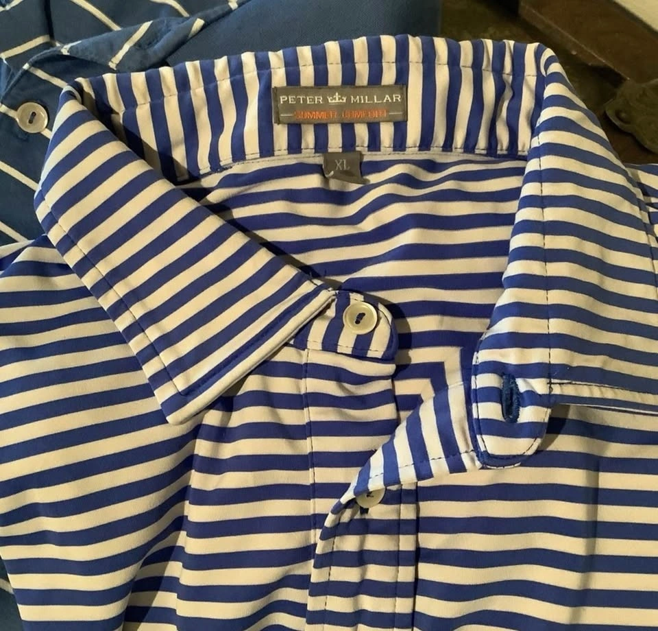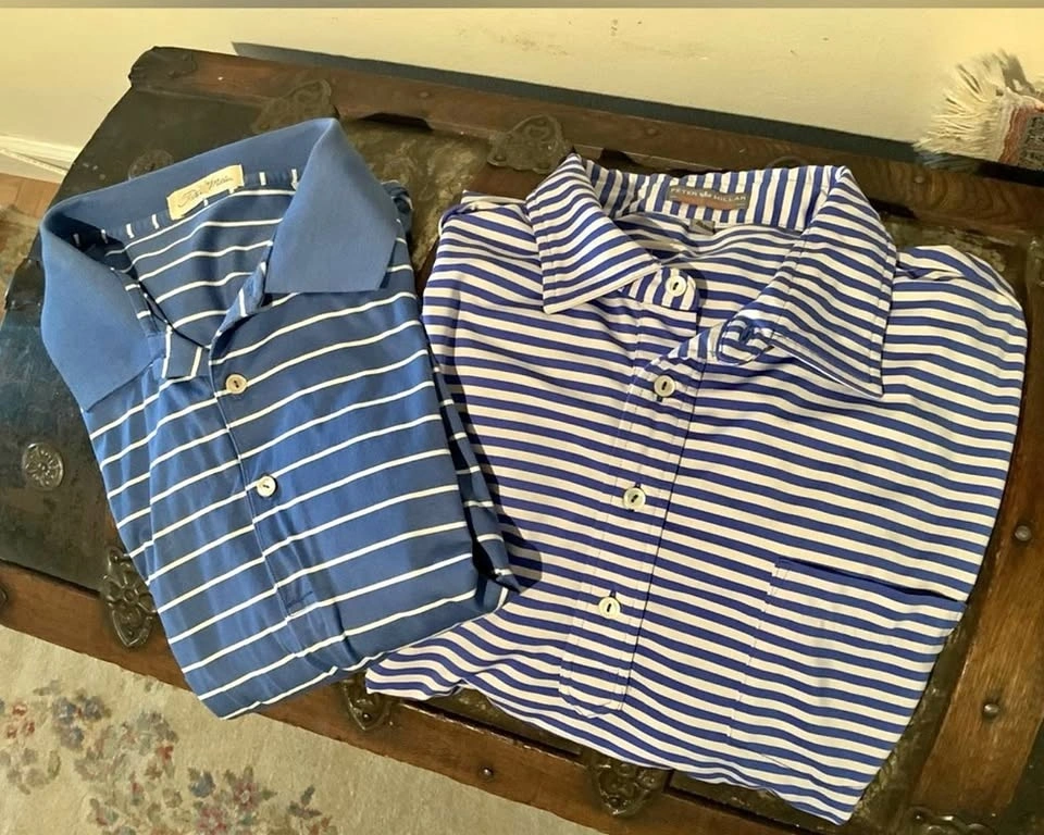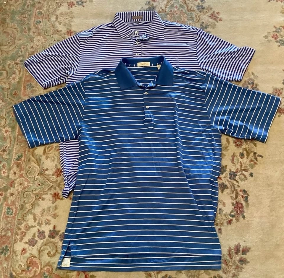 More little used golf attire from my father. Four very nice golf polos from Peter Millar, all which retailed for over $140 when new and a couple only worn a few times. Two striped polos, one white with blue stripes, the other blue with white, â solid pink and final one is a very dark olive green.