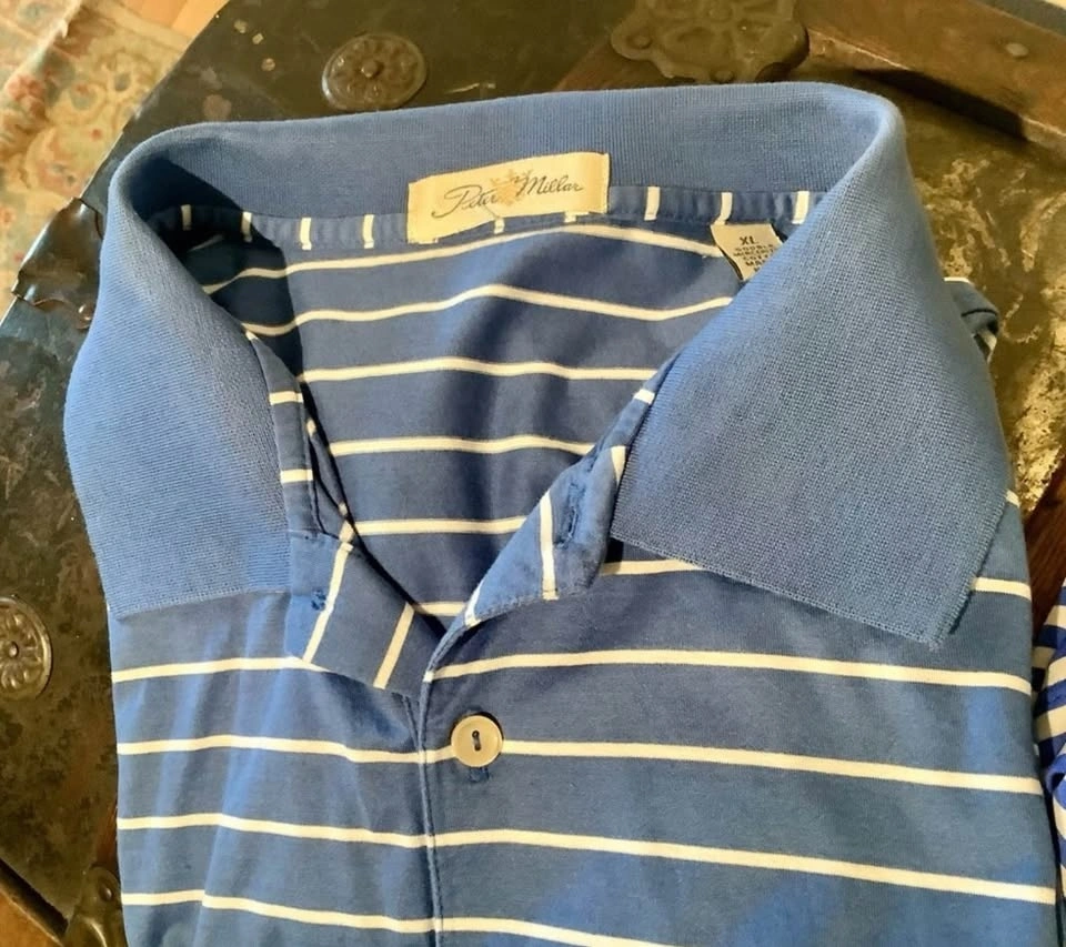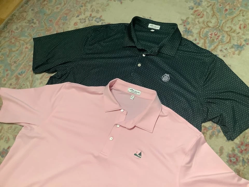 More little used golf attire from my father. Four very nice golf polos from Peter Millar, all which retailed for over $140 when new and a couple only worn a few times. Two striped polos, one white with blue stripes, the other blue with white, â solid pink and final one is a very dark olive green.