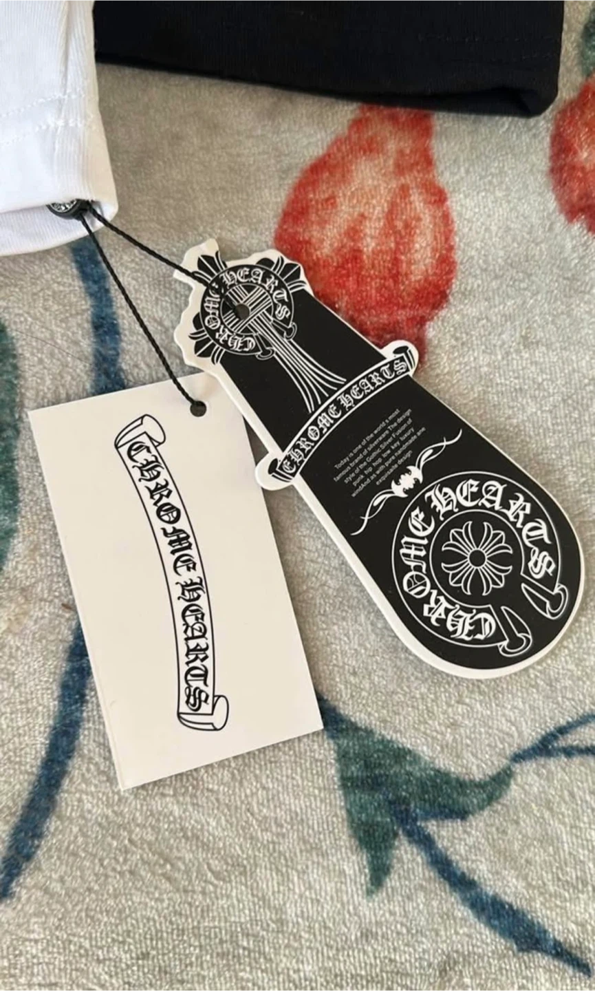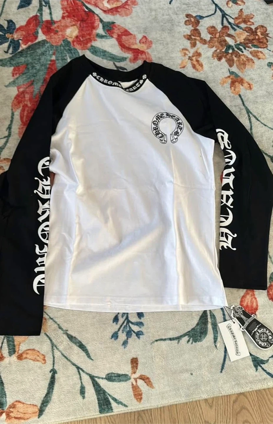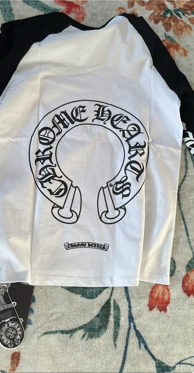 Selling a Chrome Hearts raglan shirt in white and black. It features the iconic Chrome Hearts logo on the front and sleeves. The shirt is in great condition and ready for a new wardrobe!