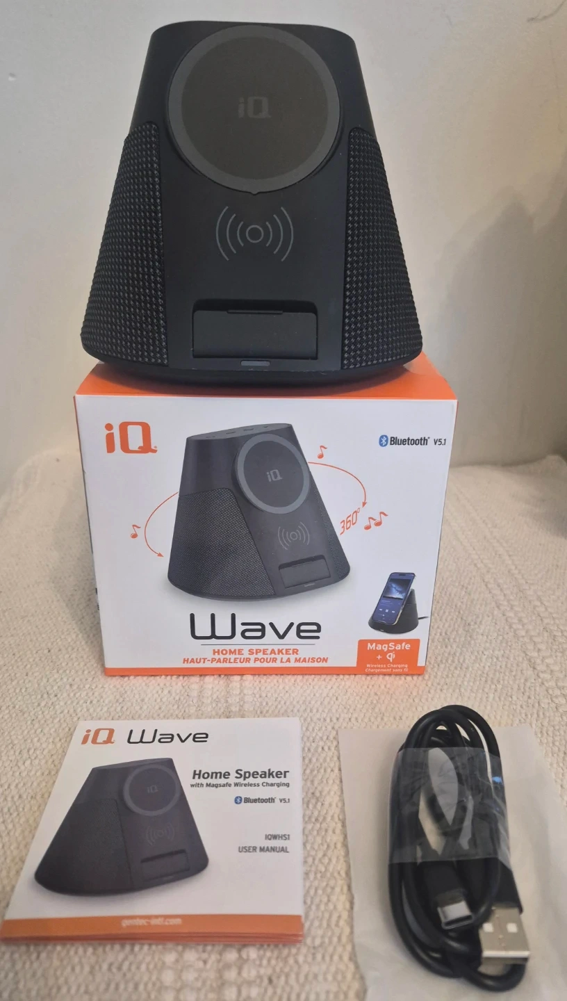 Selling an iQ Wave Home Speaker with MagSafe Wireless Charging. It comes with Bluetooth v5.1. Also included is the user manual and a charging cable. This speaker provides 360° sound. It's in great condition and ready for a new home!