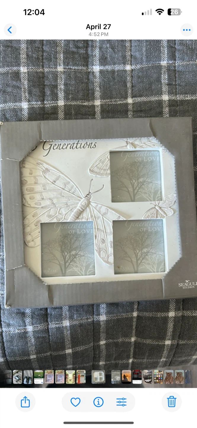 Selling a Seagull Studios '3 Generations' picture frame. It's perfect for displaying multiple cherished memories! The frame has a lovely design with butterflies and space for three photos. Great for adding a personal touch to your home decor