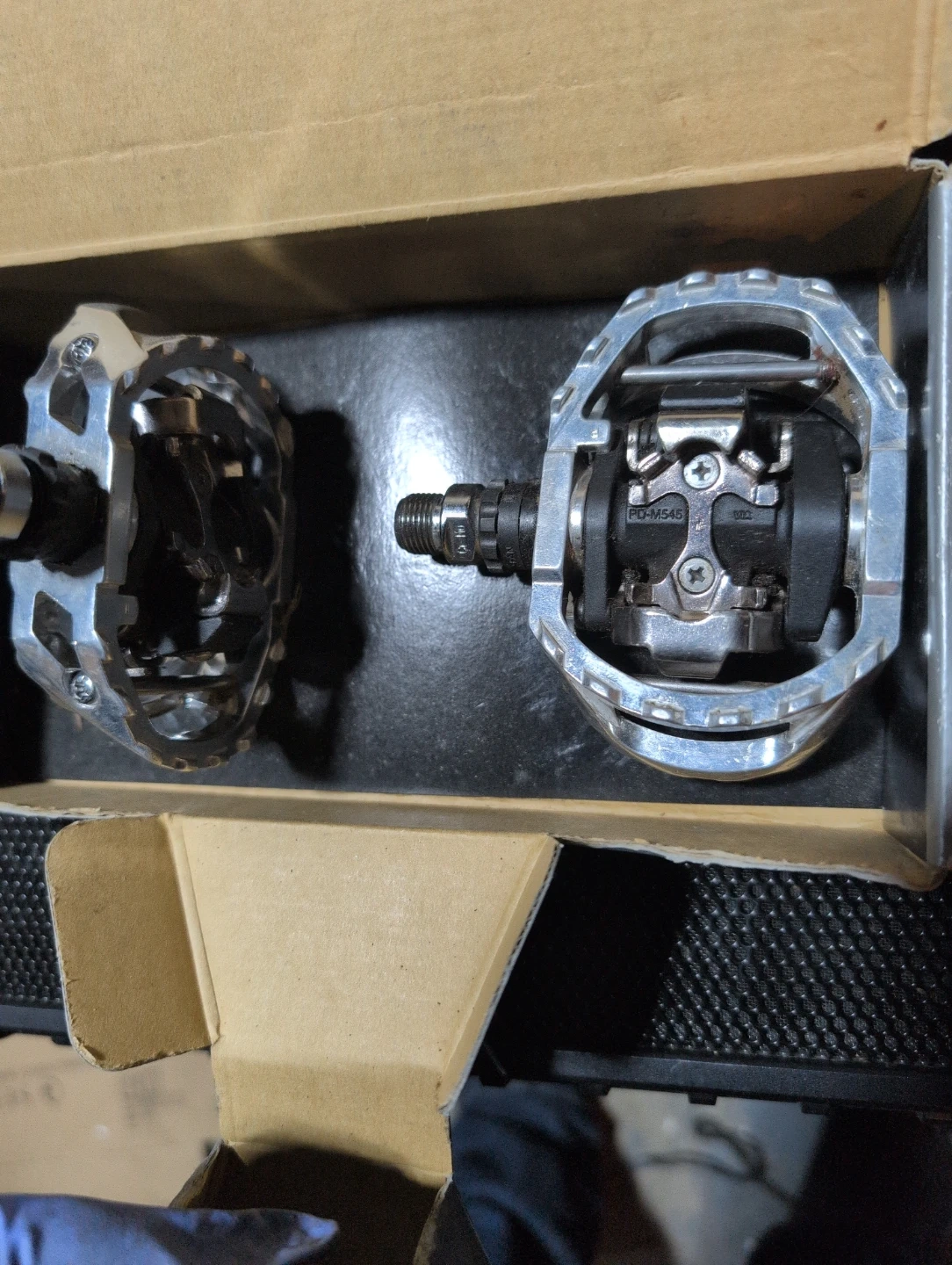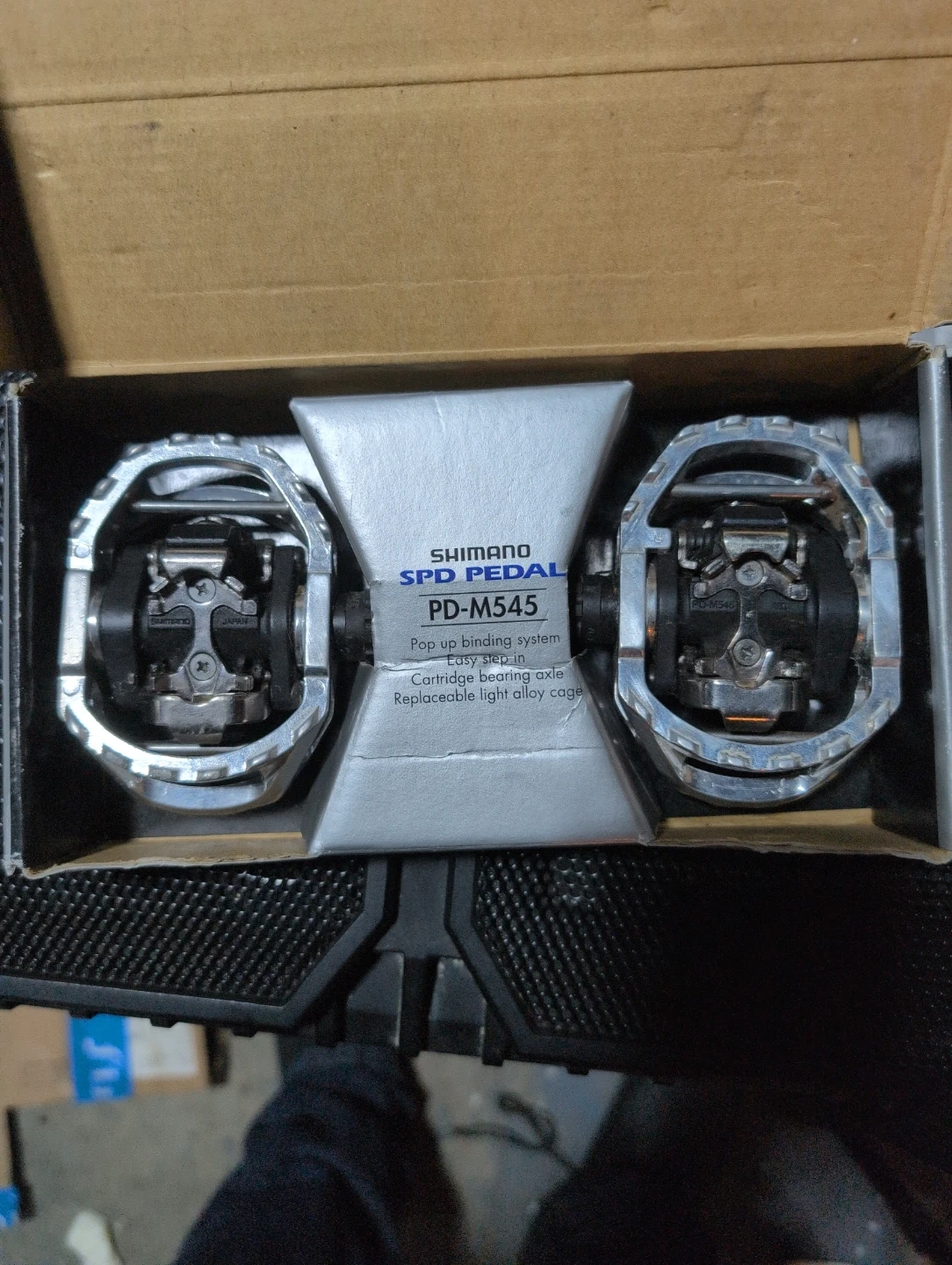 Selling a pair of Shimano SPD Pedals, model PD-M545. They're in excellent condition and come with the original box. These pedals feature a pop-up binding system, cartridge bearing axle, and a replaceable light alloy cage. Great for mountain biking!