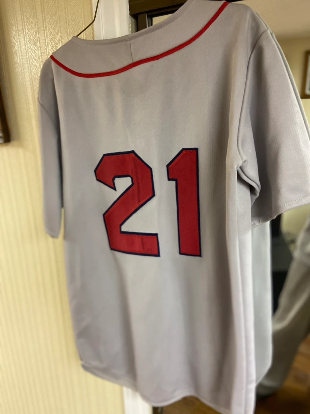 Selling a Ravens Athletic baseball jersey featuring 'Boston' and the number 21. The jersey is grey with red accents, giving it a classic baseball look. It's in great condition and ready for a new fan!