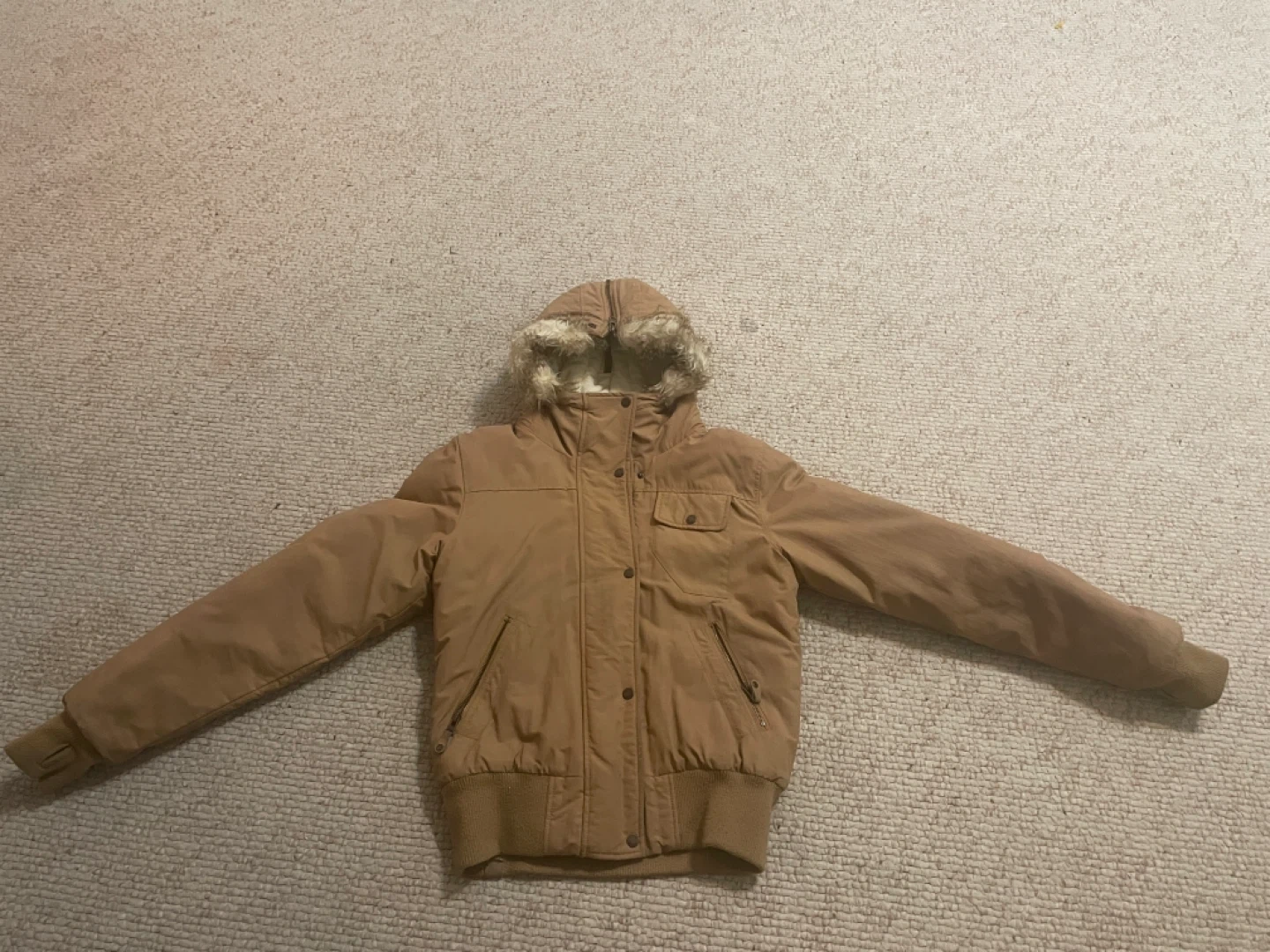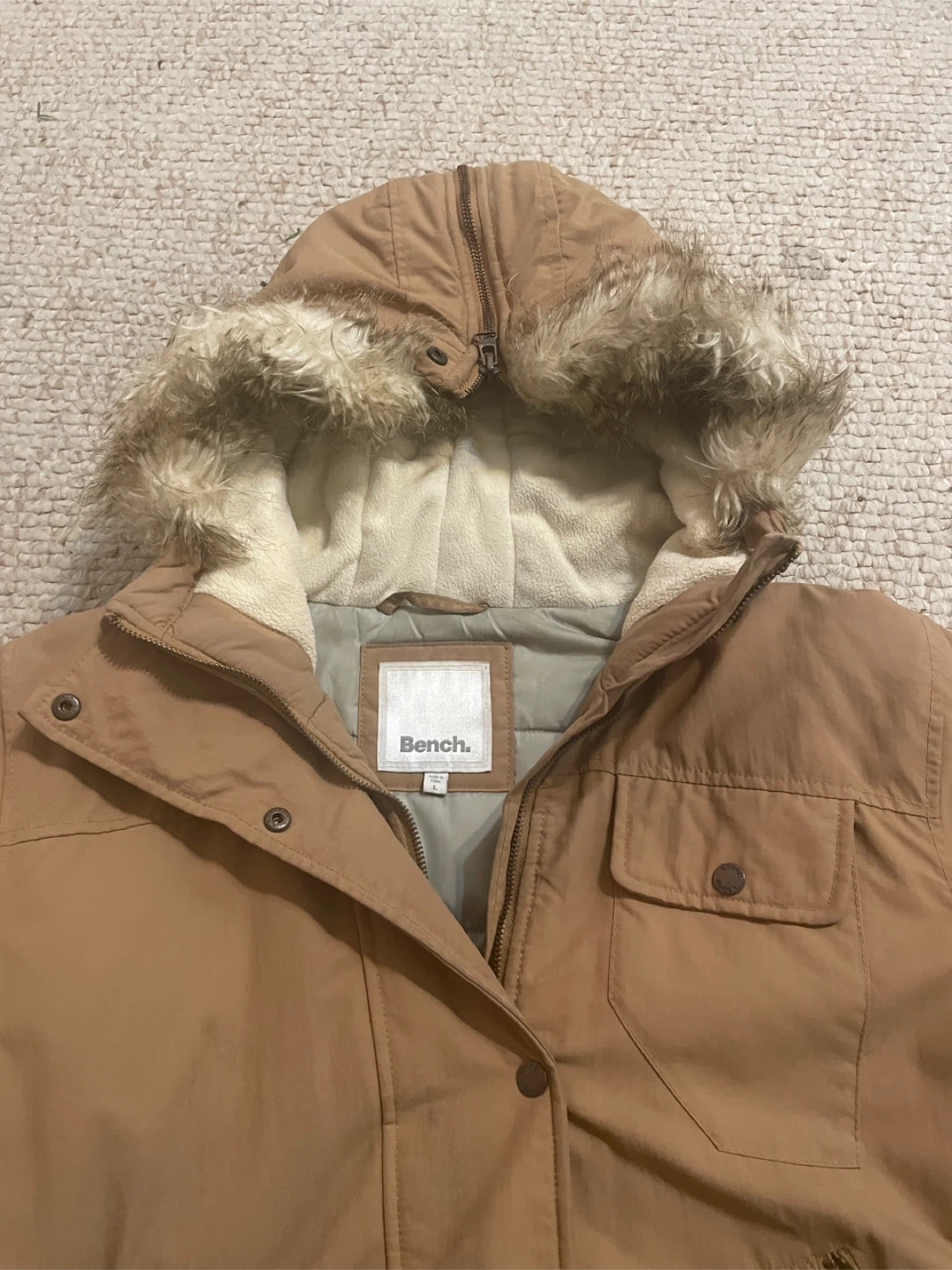 Bench. winter jacket in great condition! It's a size L and has a fur-lined hood. Perfect for staying warm during the colder months