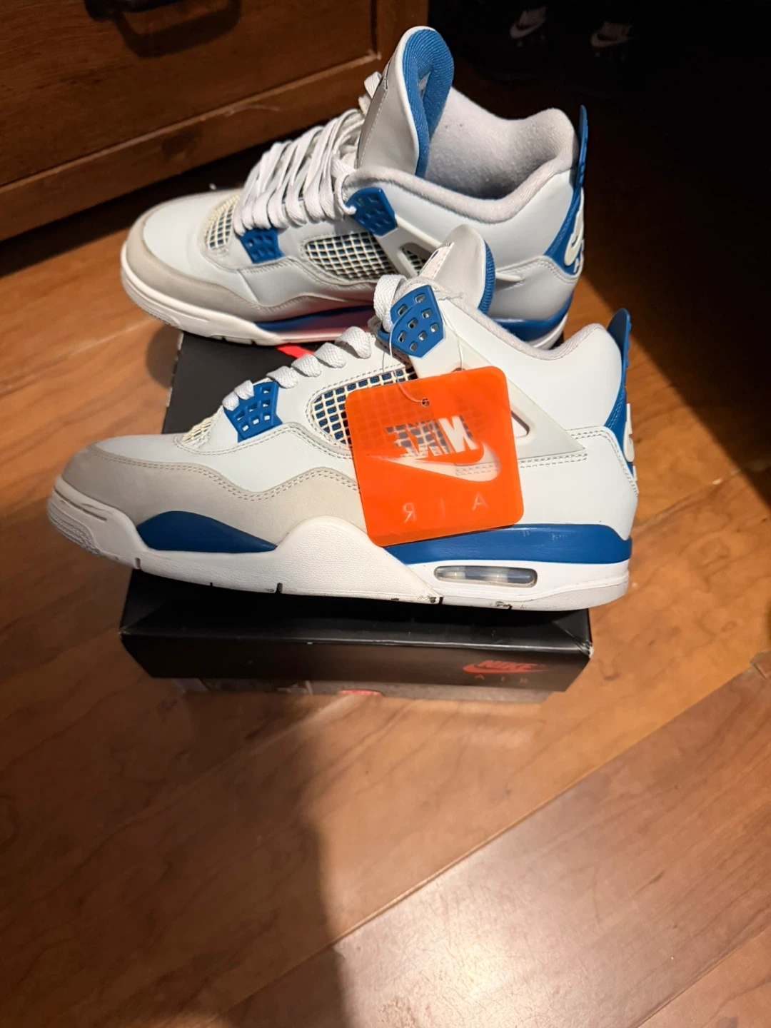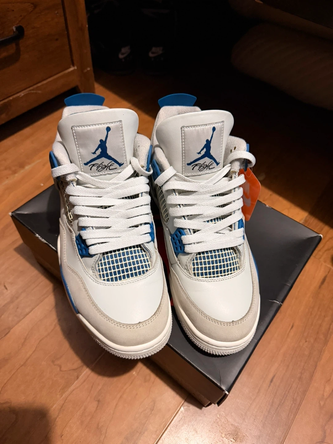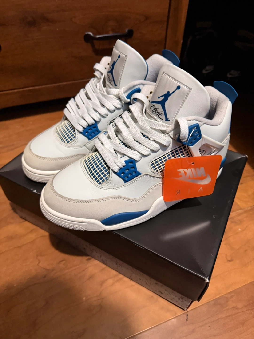 Selling a pair of Jordan 4 military blue size 8.5 men shoes are in good condition as seen in the photos there’s are no scuffs in the shoe come with original box no damage and original Nike hang tag and packing paper (WE COULD NEGOTIATE ‼️)