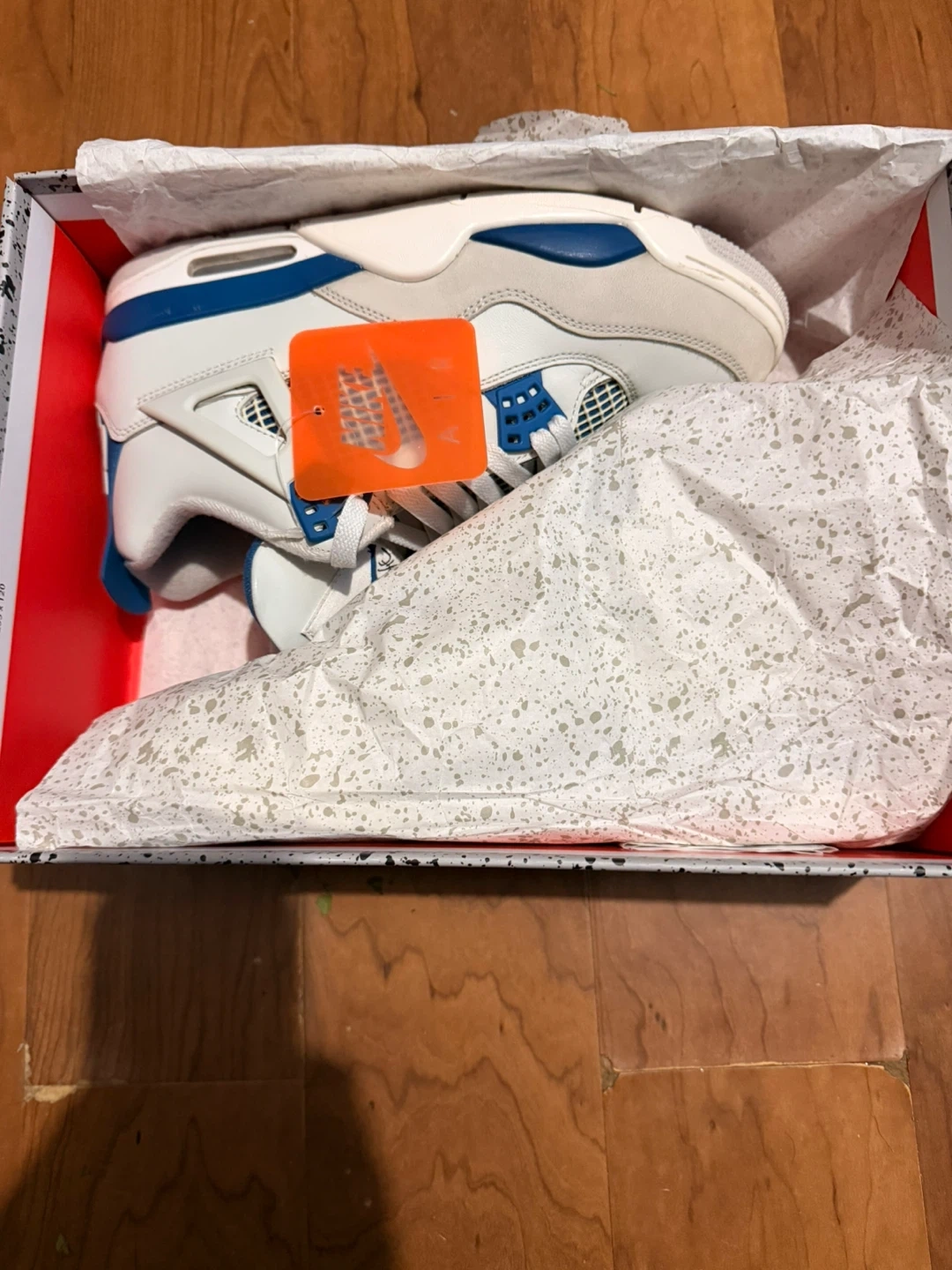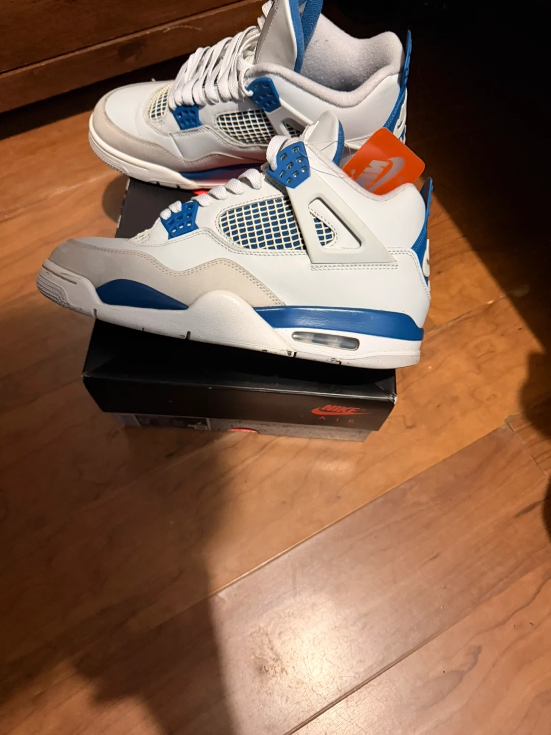 Selling a pair of Jordan 4 military blue size 8.5 men shoes are in good condition as seen in the photos there’s are no scuffs in the shoe come with original box no damage and original Nike hang tag and packing paper (WE COULD NEGOTIATE ‼️)