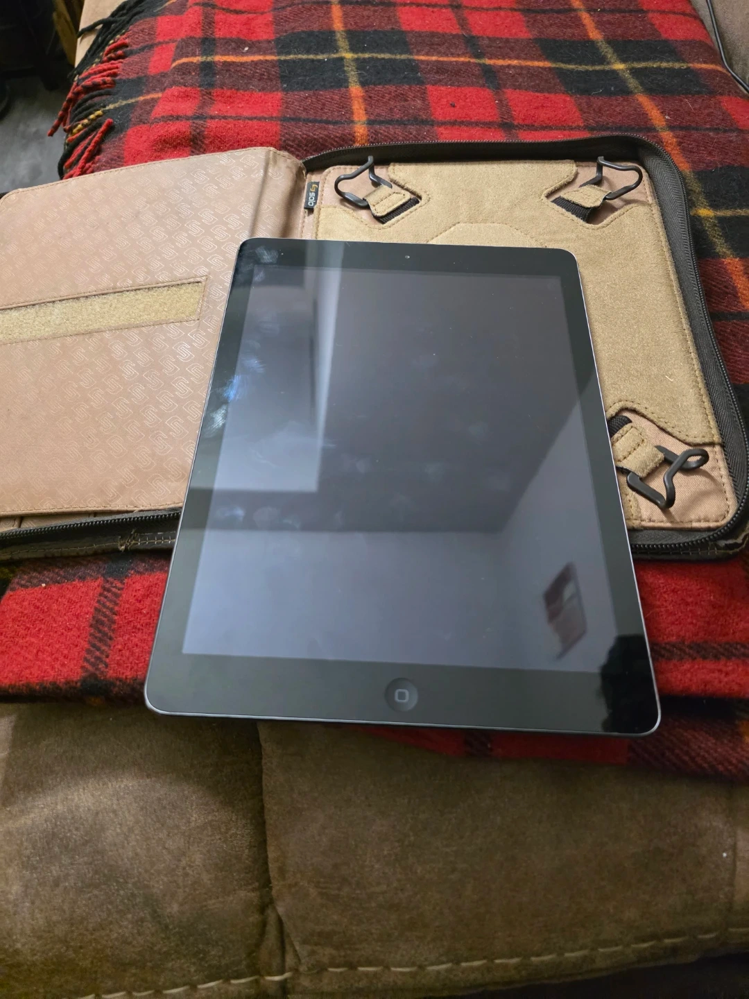 Selling an Apple iPad with a brown leather case. It's in good condition and ready for a new user. Perfect for browsing, reading, or streaming on the go!