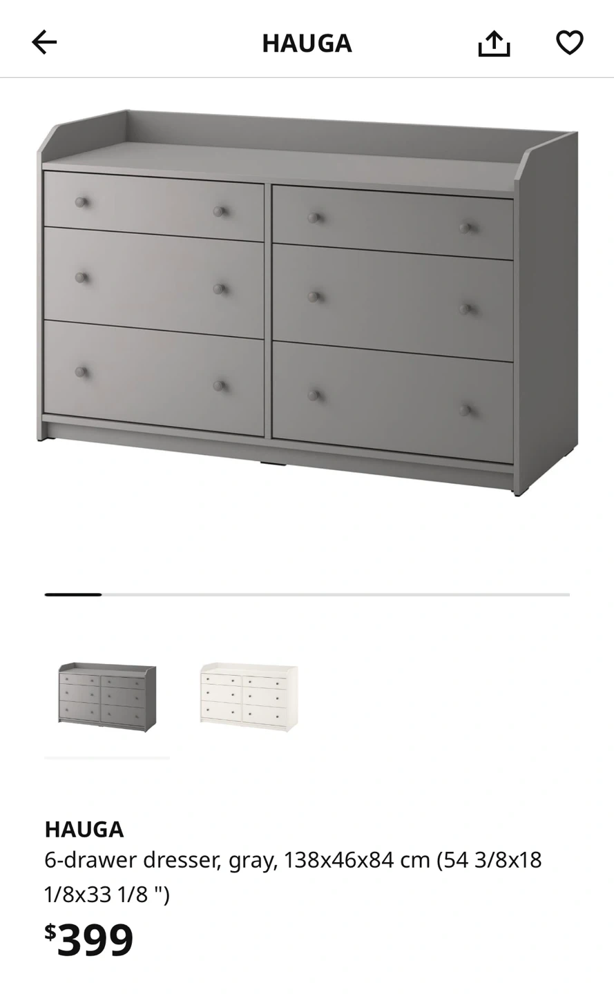 Looking to sell my IKEA Hauga 6-drawer dresser in gray! It's in great shape and ready for a new home.