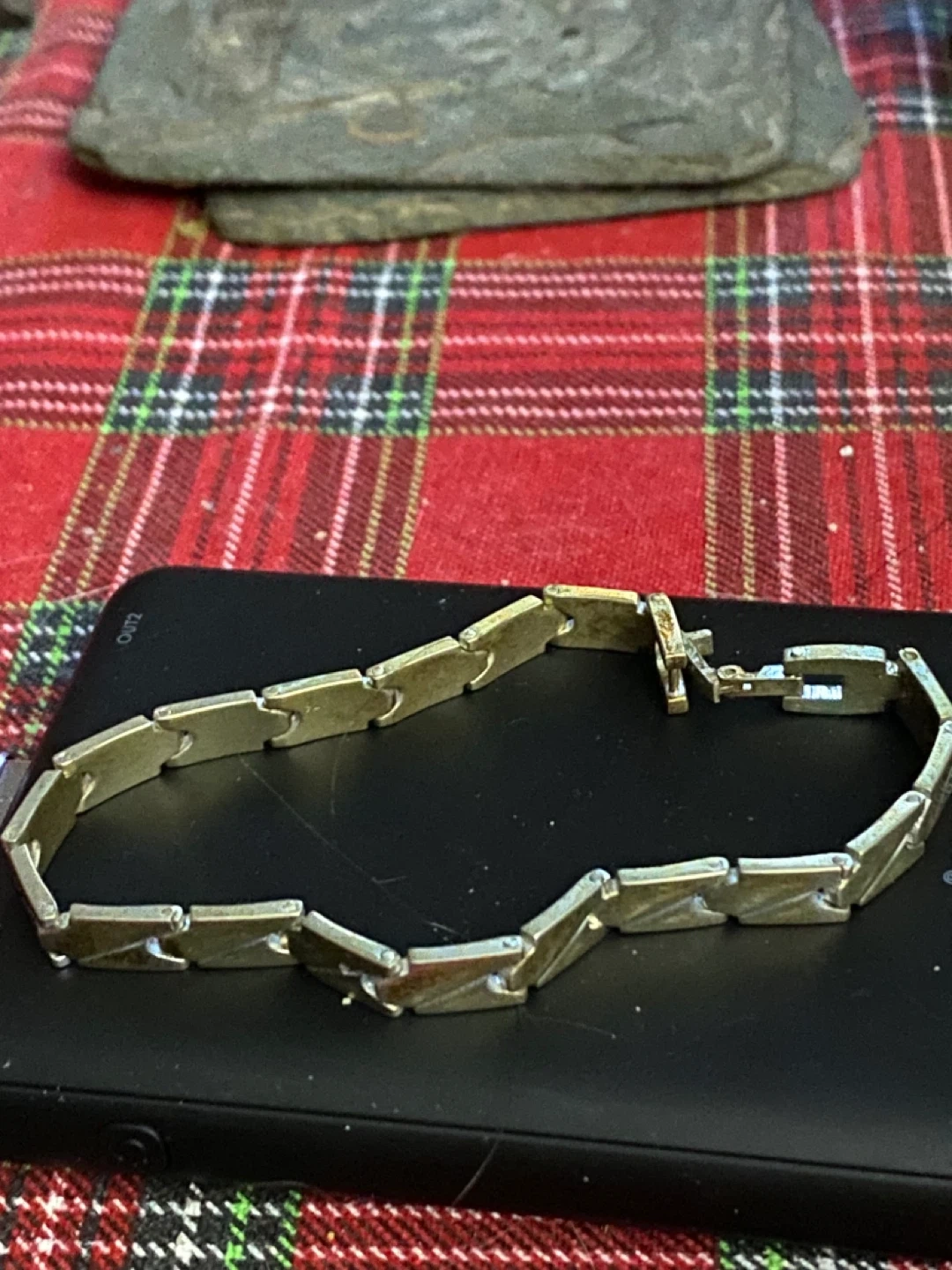 Selling a silver-toned bracelet in good condition. It has a unique design with rectangular links and a secure clasp. Perfect for adding a touch of elegance to any outfit