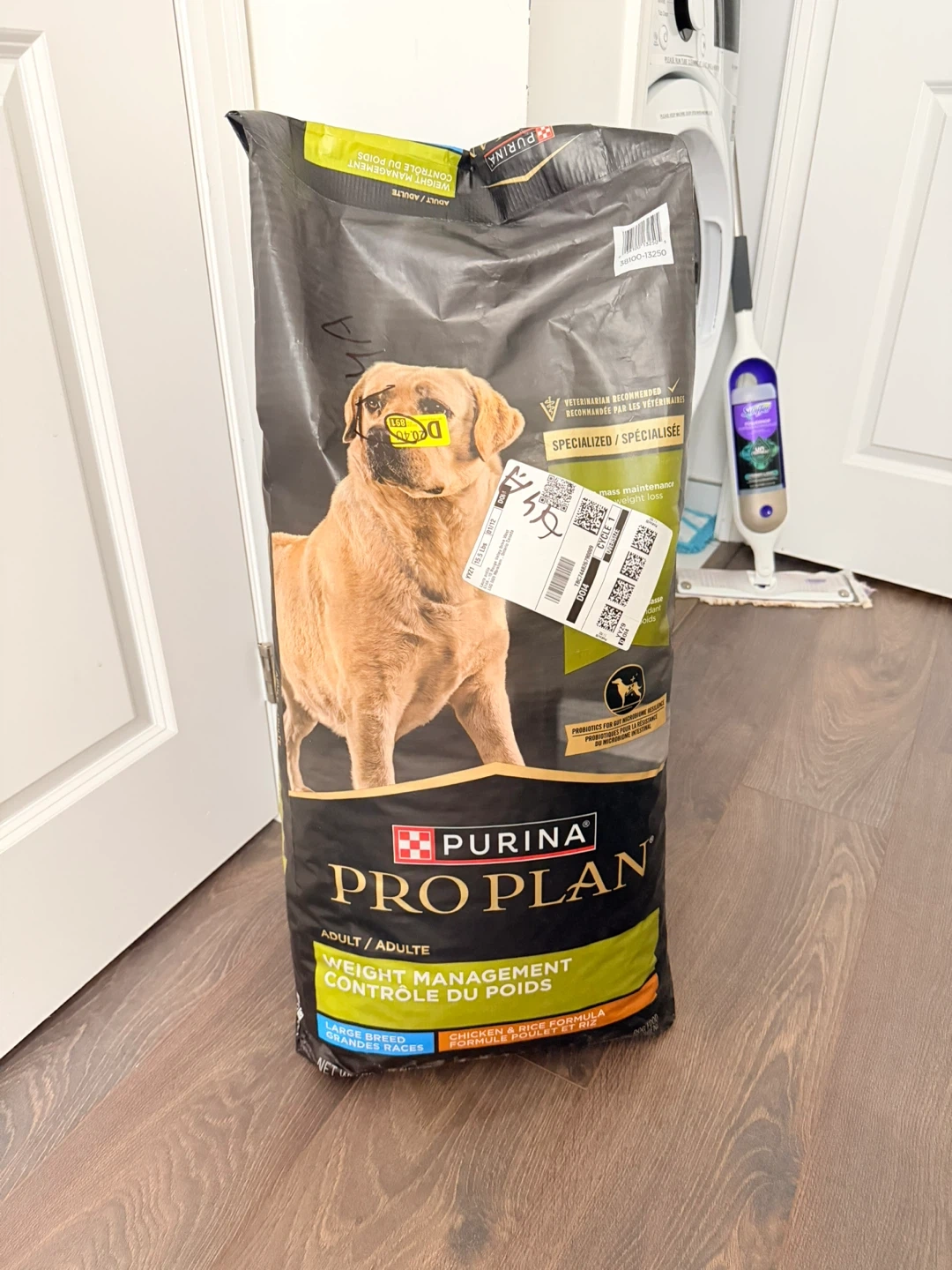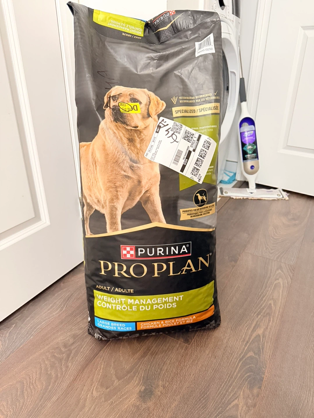 Selling a bag of Purina Pro Plan Adult Weight Management dog food for large breed dogs. It's chicken and rice flavour. The bag is 34 lbs. It is formulated for unique needs and is 15% less fat.