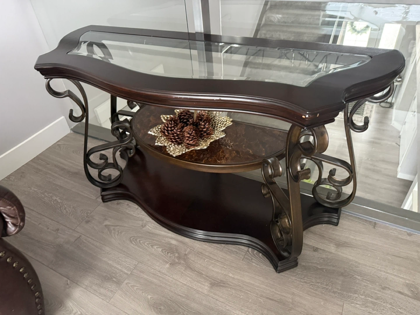 Selling a beautiful glass-top coffee table with a dark wood finish. It features a unique design with ornate metal accents. The table has a lower shelf for storage or display. It's in great condition and would be a lovely addition to any living room