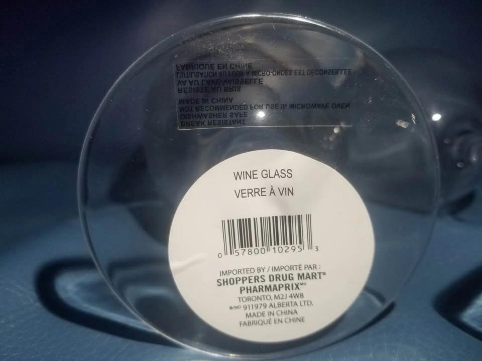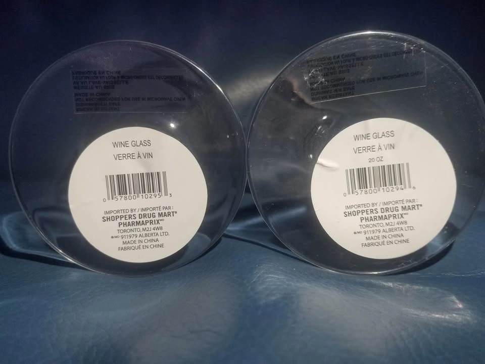 Brand new plastic wine glasses, never used. Purchased from Shoppers Drug Mart — stickers still on the bottom.