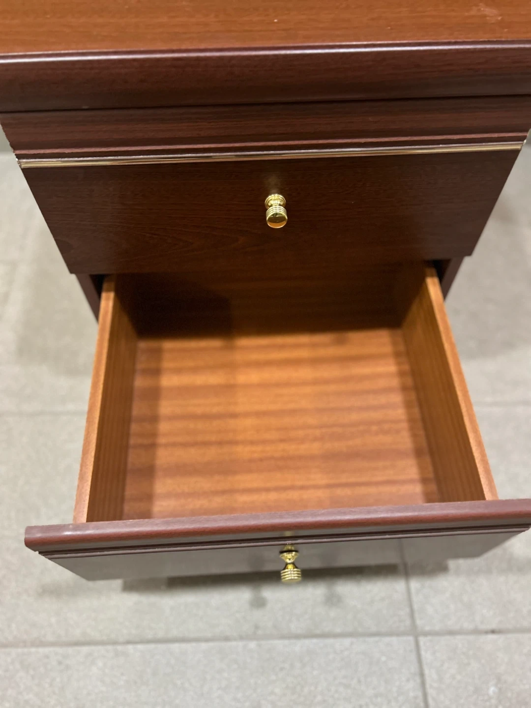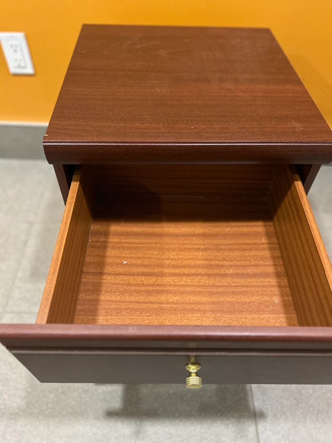 Here's a lovely wood nightstand with two drawers! It's perfect for keeping your bedside essentials organized. The drawers slide smoothly, and the wood finish adds a touch of warmth to any room