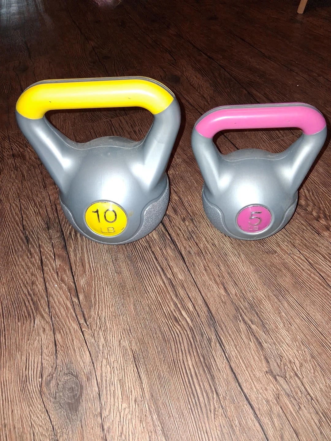 Selling a pair of kettlebells! One is 10 lbs with a yellow handle, and the other is 5 lbs with a pink handle