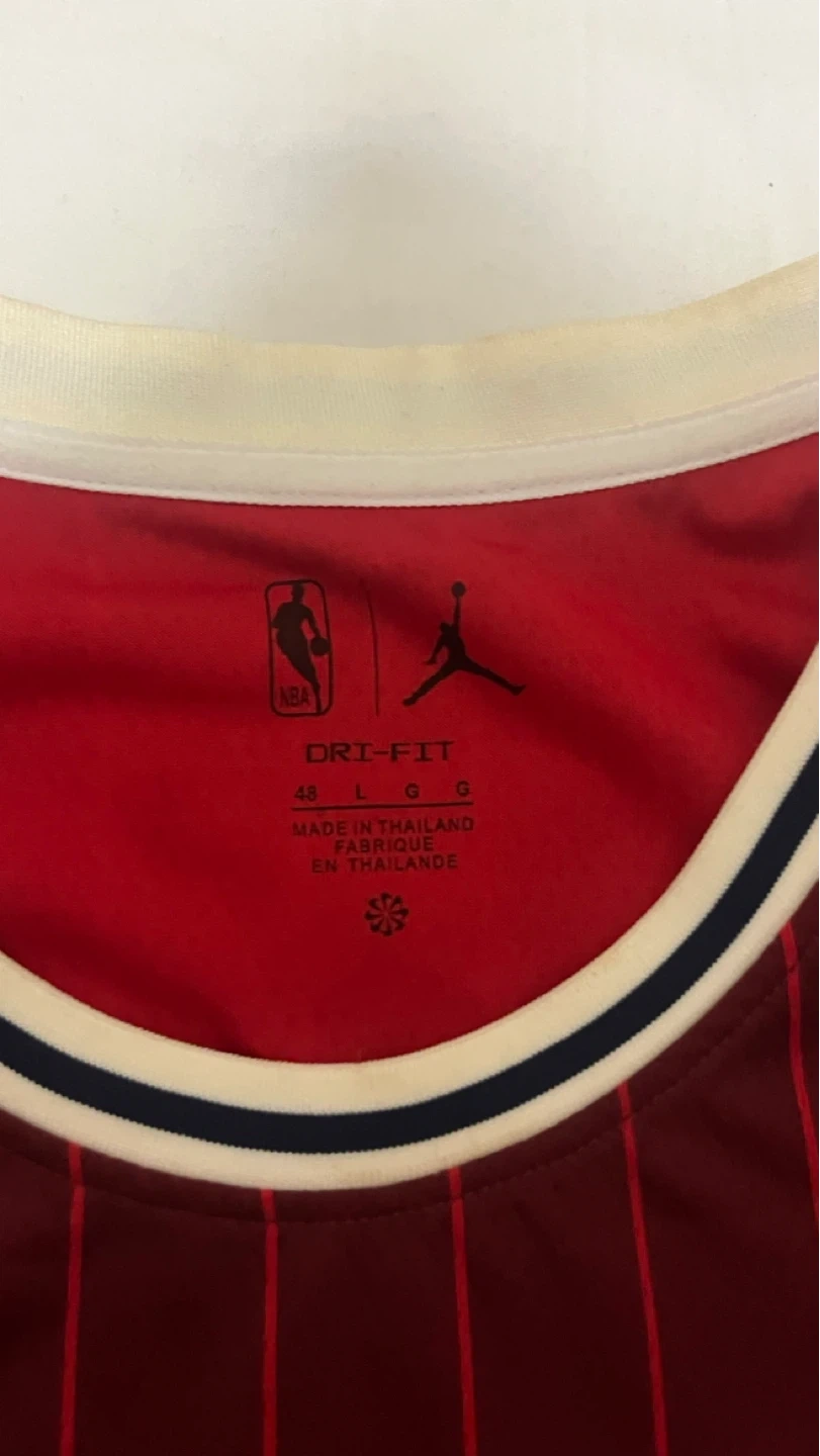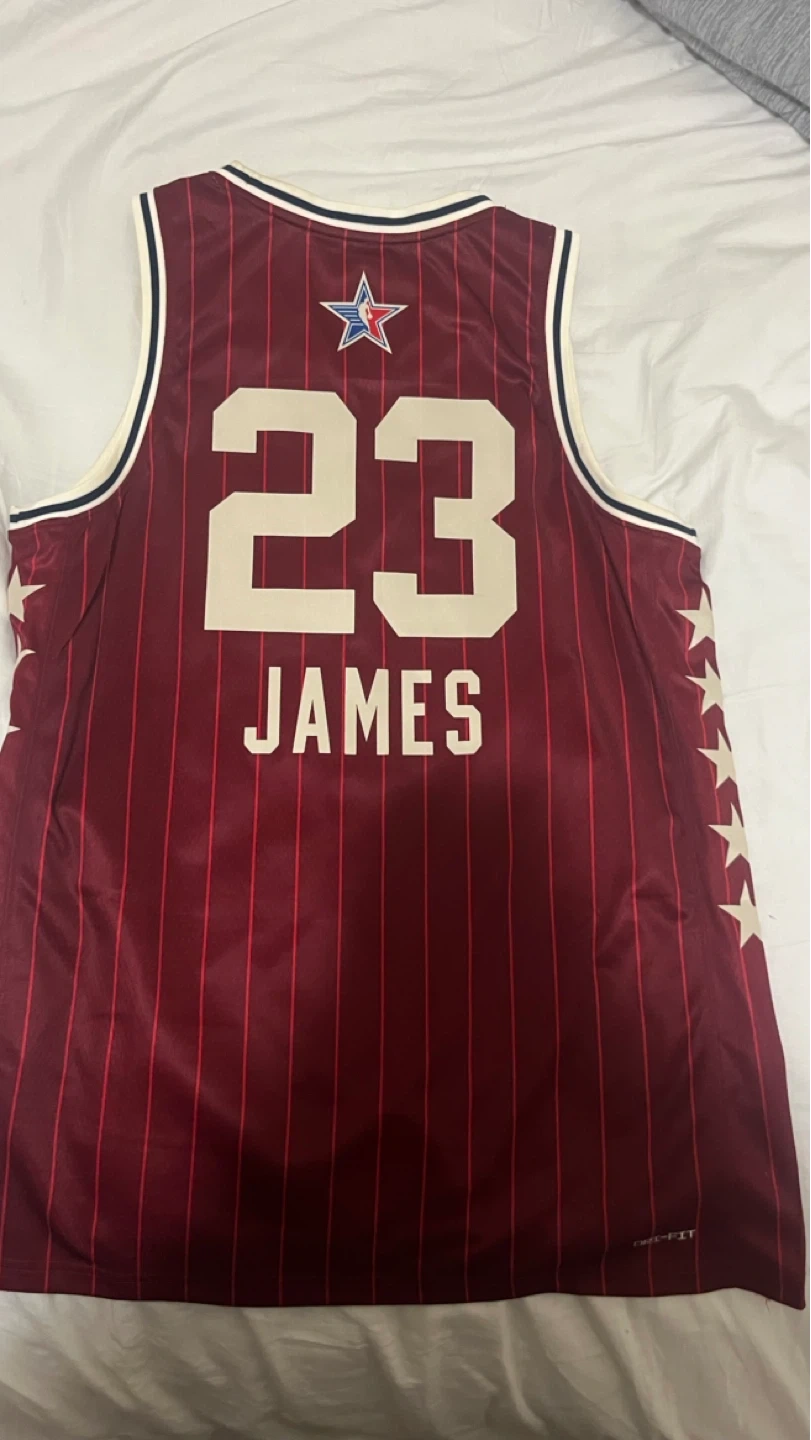Selling a Jordan NBA All-Star jersey, featuring James #23 on the back! It's a size Large (48). The jersey is maroon with white accents and stars on the sides. It's the 73rd Annual All-Star edition. Made with Dri-FIT technology for comfort and performance!