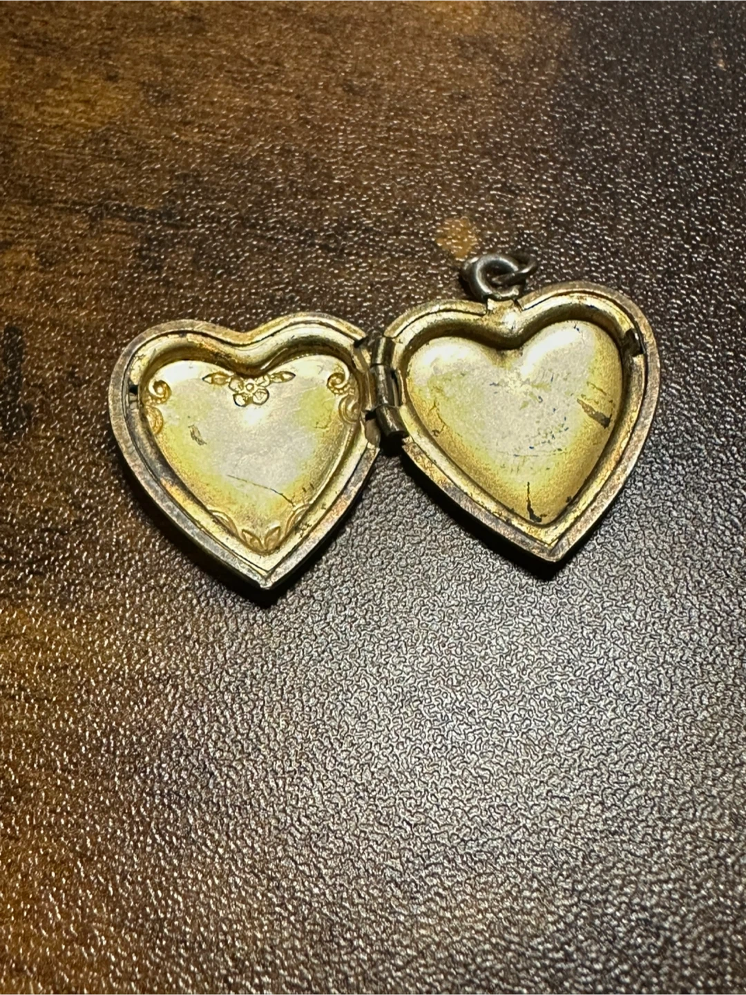 I can’t find a maker’s mark on this piece, but my gut is telling me that it’s silver. This is from my husband’s grandmother’s collection and she had a lot of silver and some gold. The chain is missing, but the locket is in great condition despite being tarnished on the outside. A good jewelry bath will have it shining again.