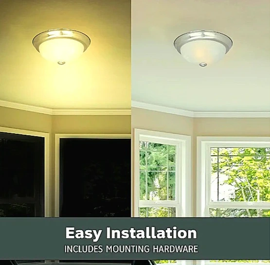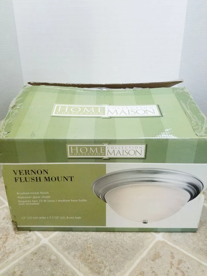 Illuminate your home with this brand new Home Maison Vernon flush mount ceiling light, featuring a brushed nickel finish and alabaster glass shade. Designed for use with two 60-watt (max) medium base bulbs, it measures 5.3 inches (13.3 cm) wide and 5.7/16 inches (13.8 cm) high.