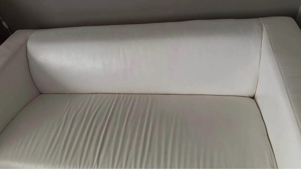 Condo size 2 seater modern sleek white vegan leather sofa couch perfect for small spaces. Looks great with cushions. See all pics. Size: 69” x 34”