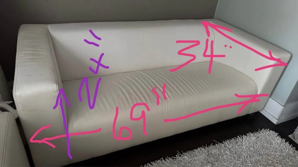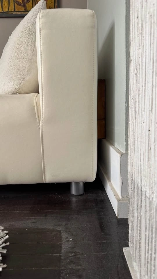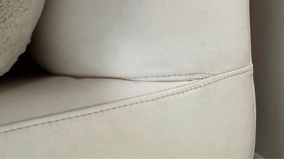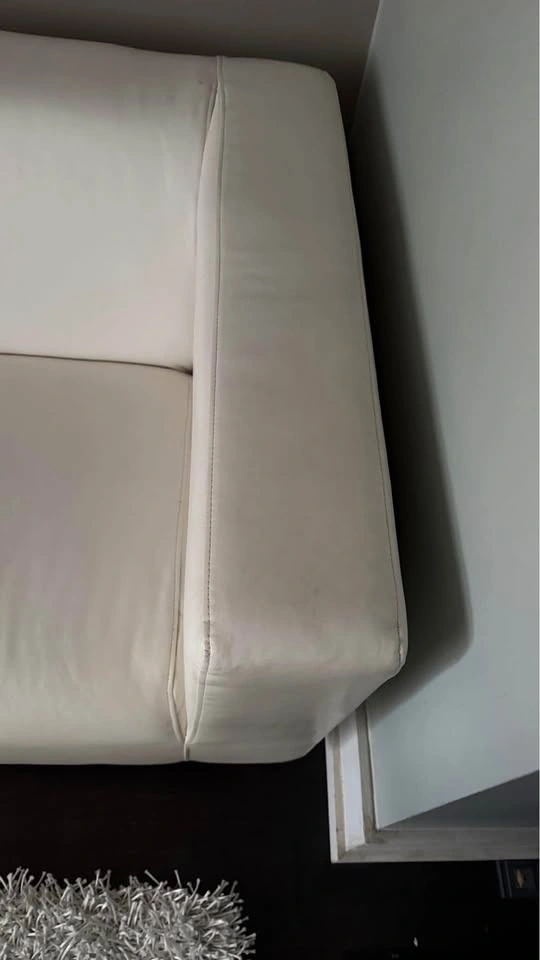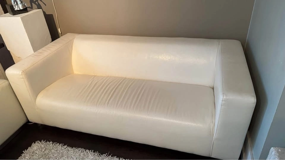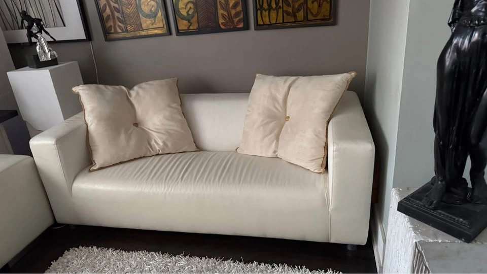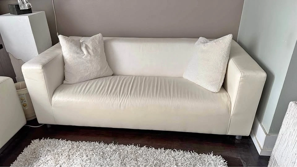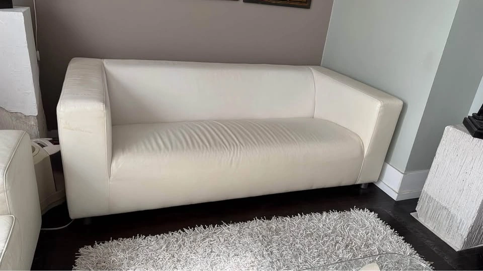 Condo size 2 seater modern sleek white vegan leather sofa couch perfect for small spaces. Looks great with cushions. See all pics. Size: 69” x 34”
