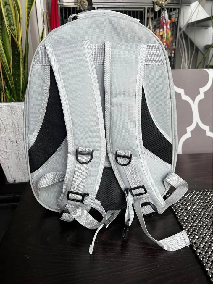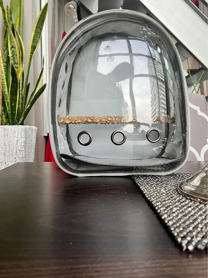 New animal Backpack or travel nap sack carrier cage is great for med size (or smaller) bird/parrot. Comes with removable perch so can be used for cats, ferrets, or small dogs too. Clear plastic dome like window with lots of ventilation for the pet to experience it’s surroundings. Lighter Grey colour fabric with zippers.