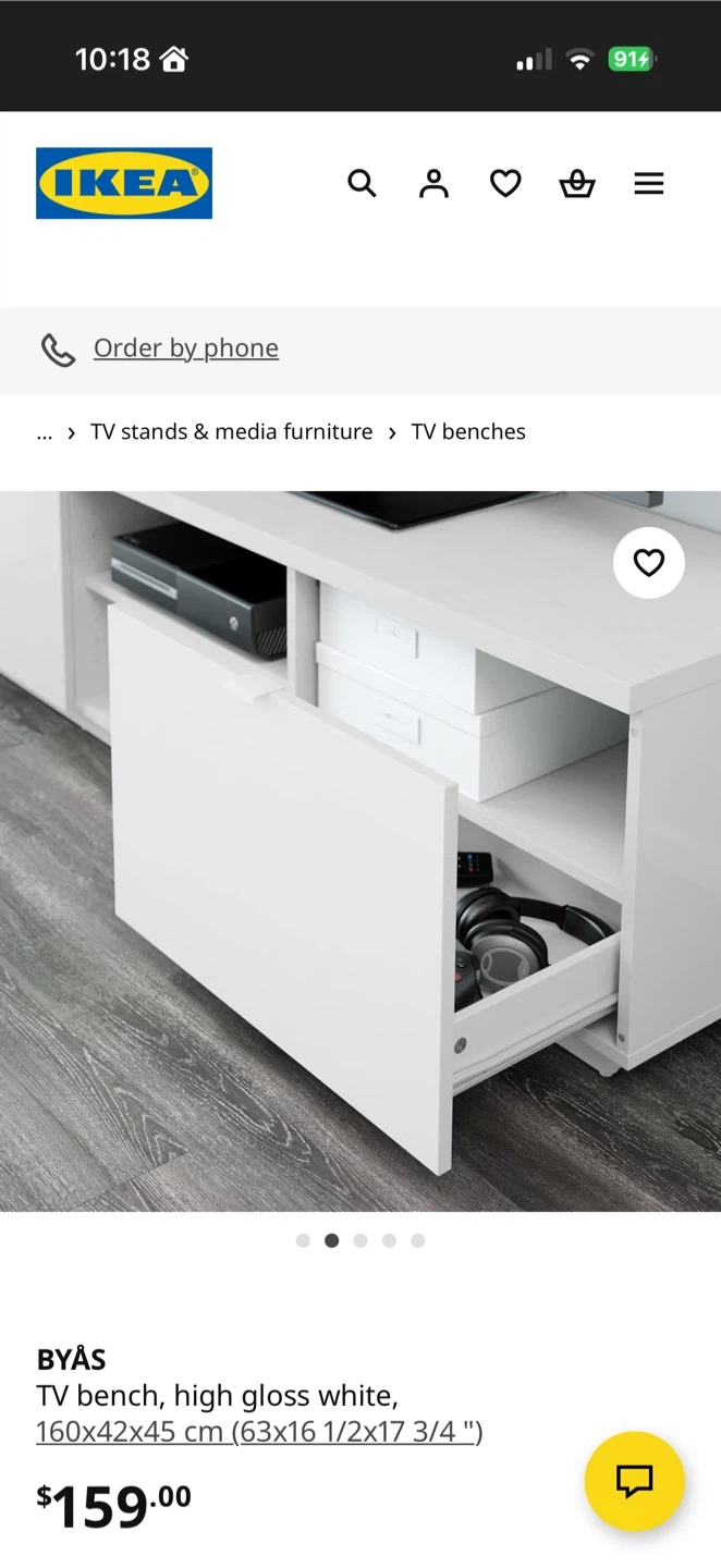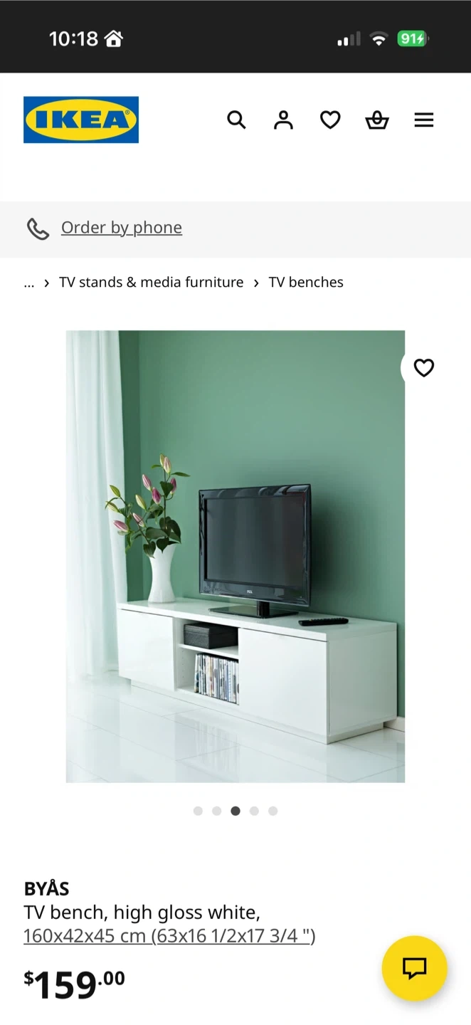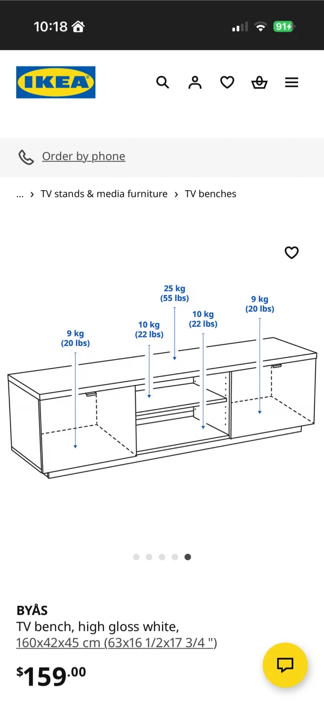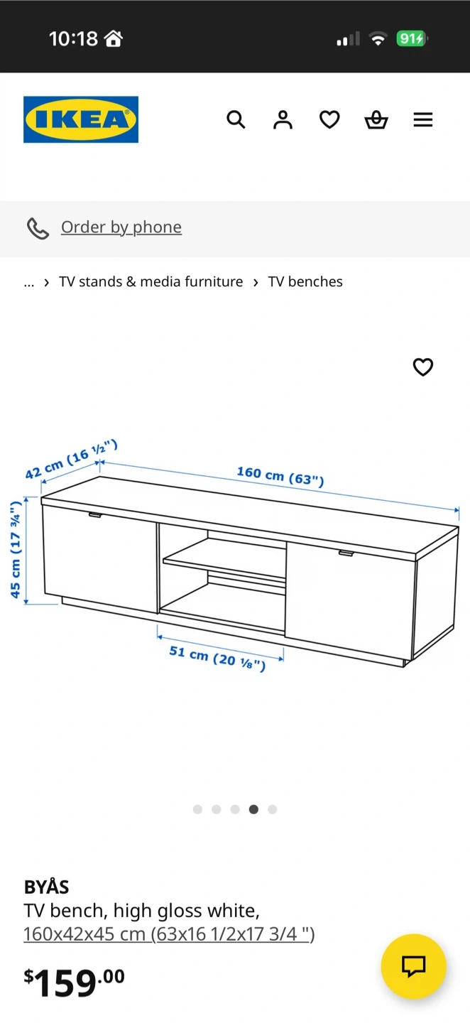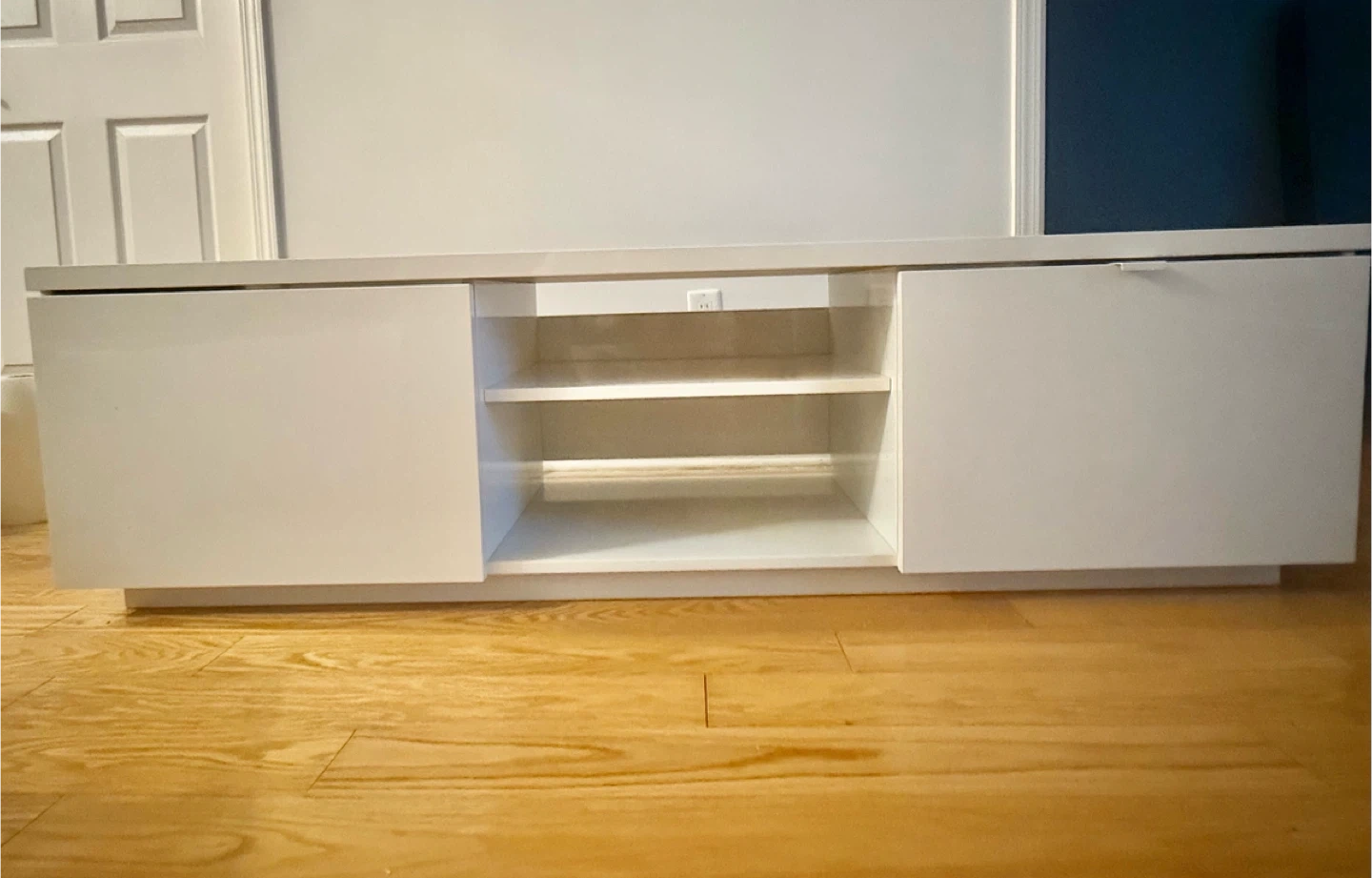 Selling an IKEA BYÅS TV bench in high gloss white. Very good condition as I never used it. It measures 160x42x45 cm (63x16 1/2x17 3/4 ").