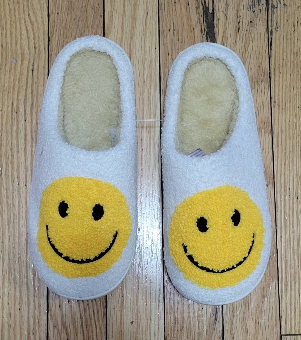 Cute smiley face slippers in a size small (5-6)! They're super comfy and perfect for wearing around the house