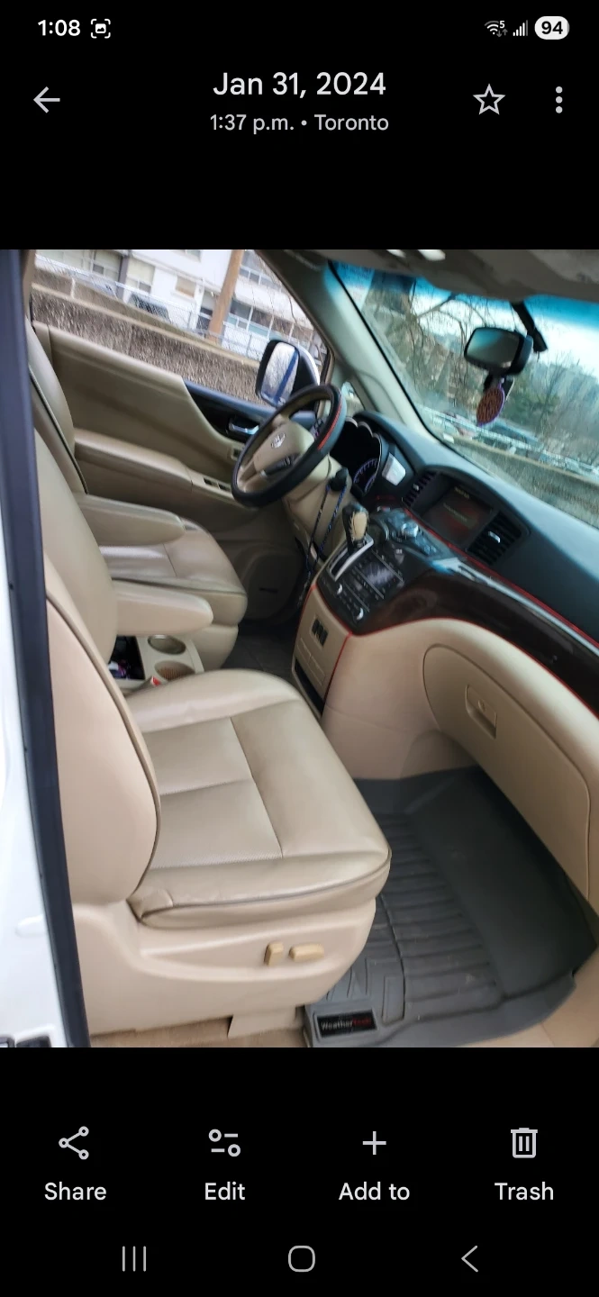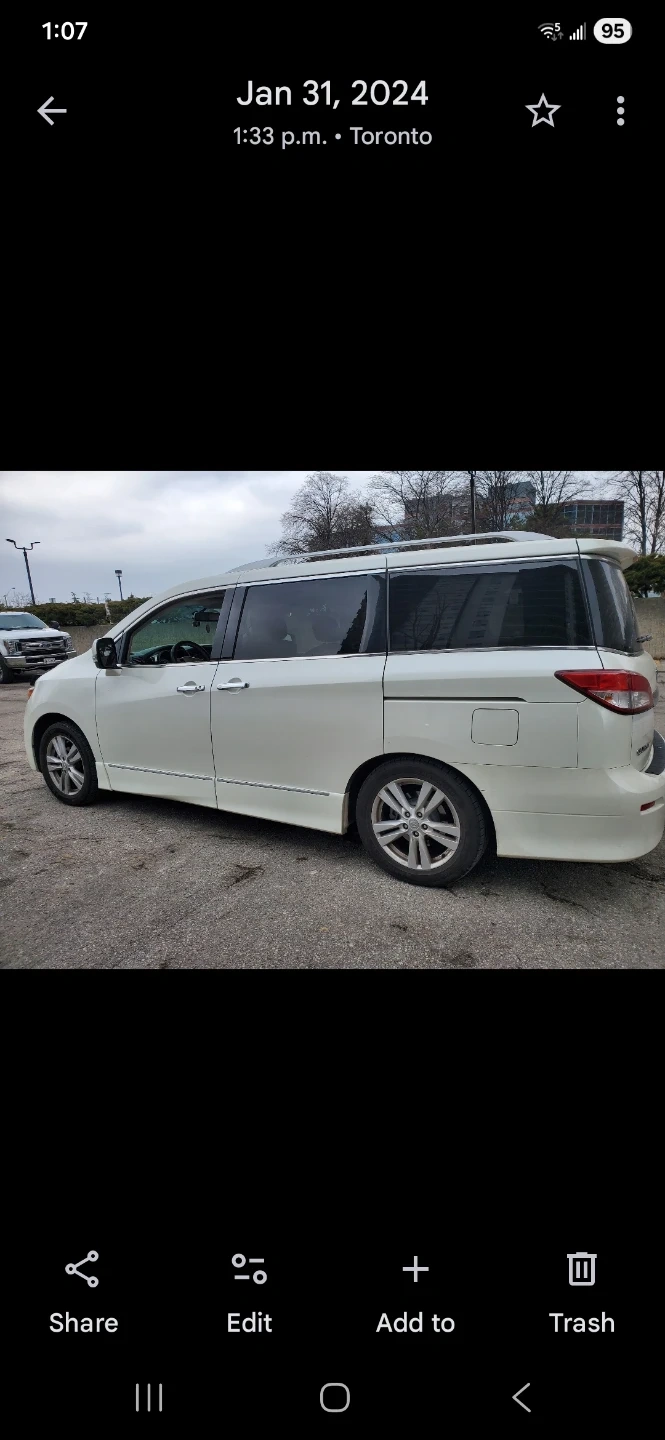 Selling a Nissan Quest minivan. It's white with a beige interior. The car appears to be in good condition and has a backup camera.