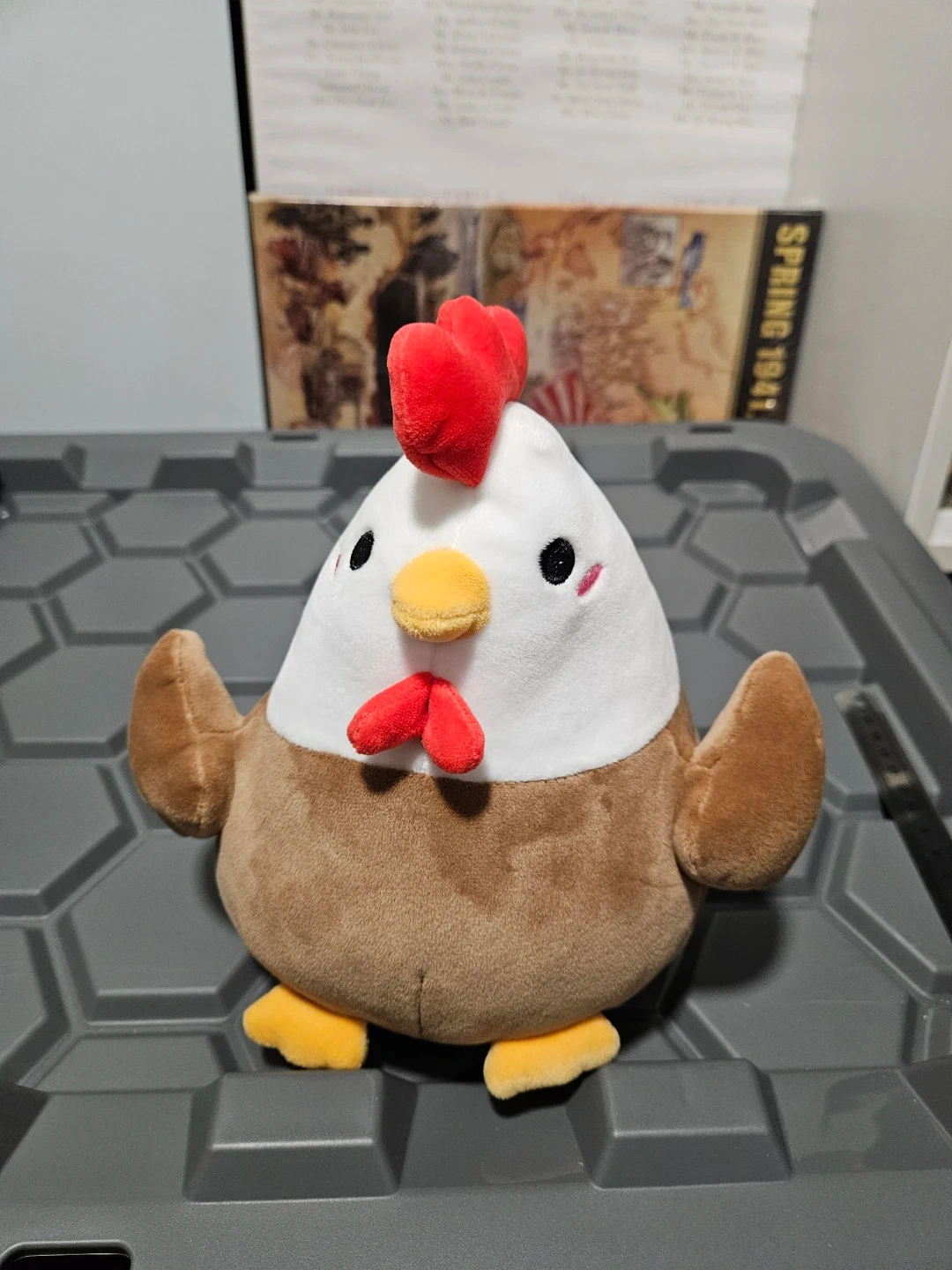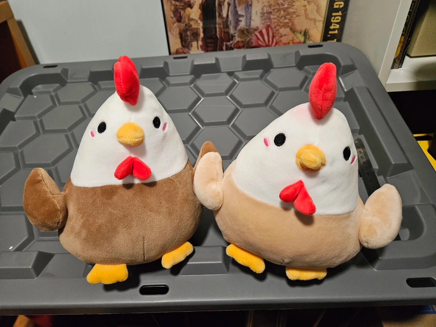 Selling a cute chicken plush toy! It's in great condition and ready to be a new friend. It has a soft, cuddly texture and is perfect for kids or anyone who loves adorable animals. Got a little red blush on lighter chicken.