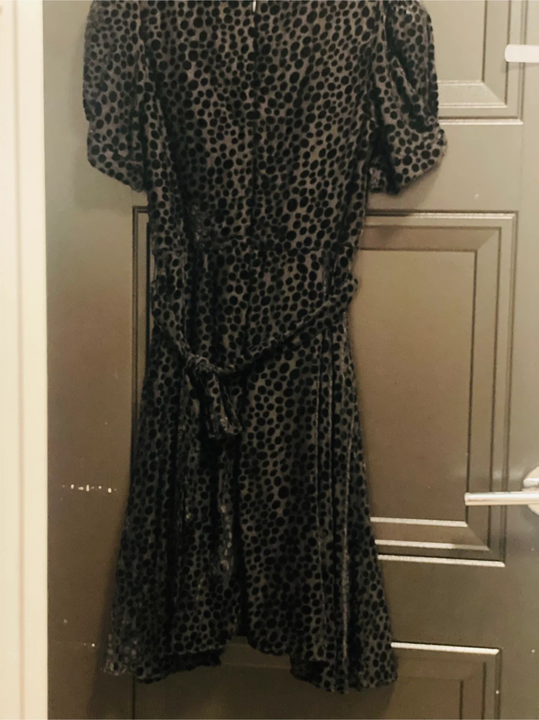 Add a touch of elegance to your wardrobe with this DKNY black velvet polka dot dress. This dress with a flattering silhouette and unique design, is perfect for a night out or a special occasion.