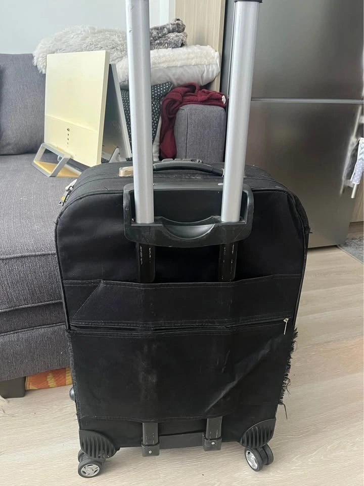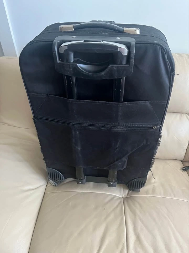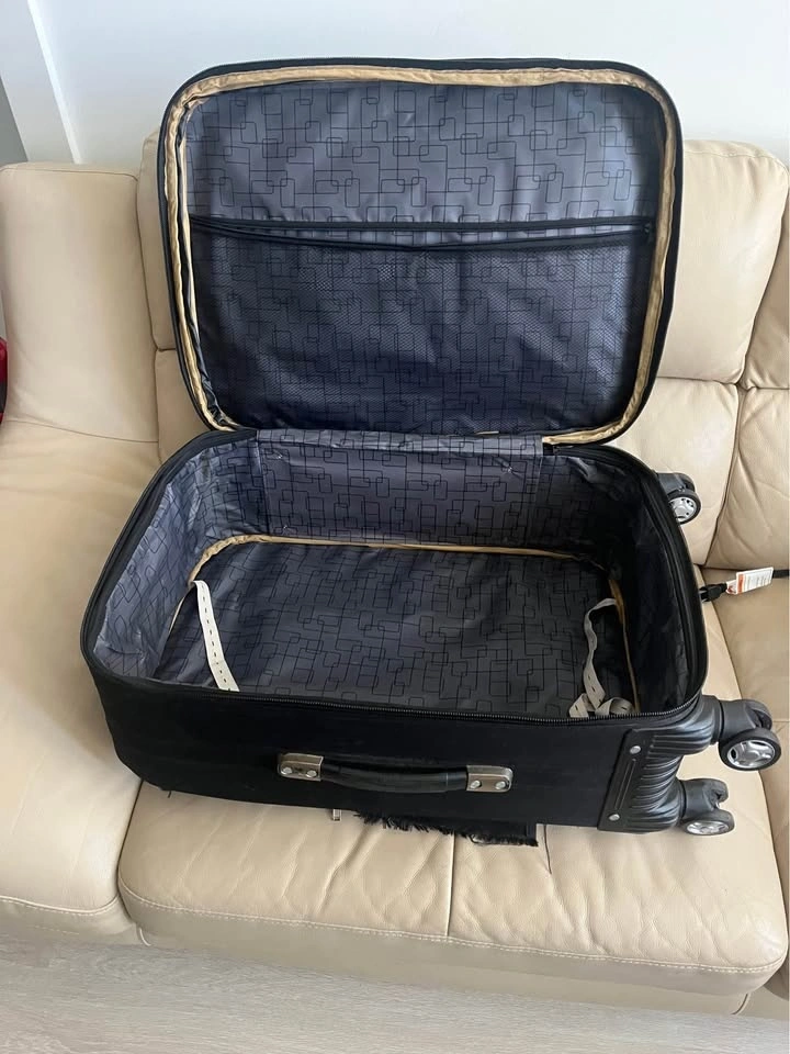 Great condition black suitcase with wheels. Measures 28 inches tall. Has multiple compartments and a sturdy handle. Interior is clean with some storage pockets.