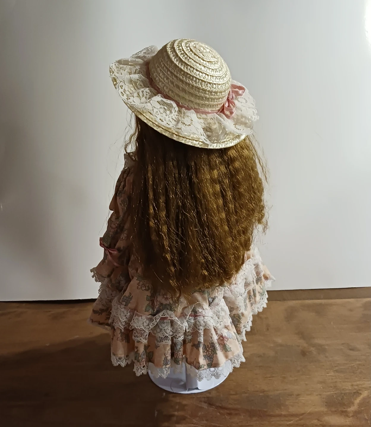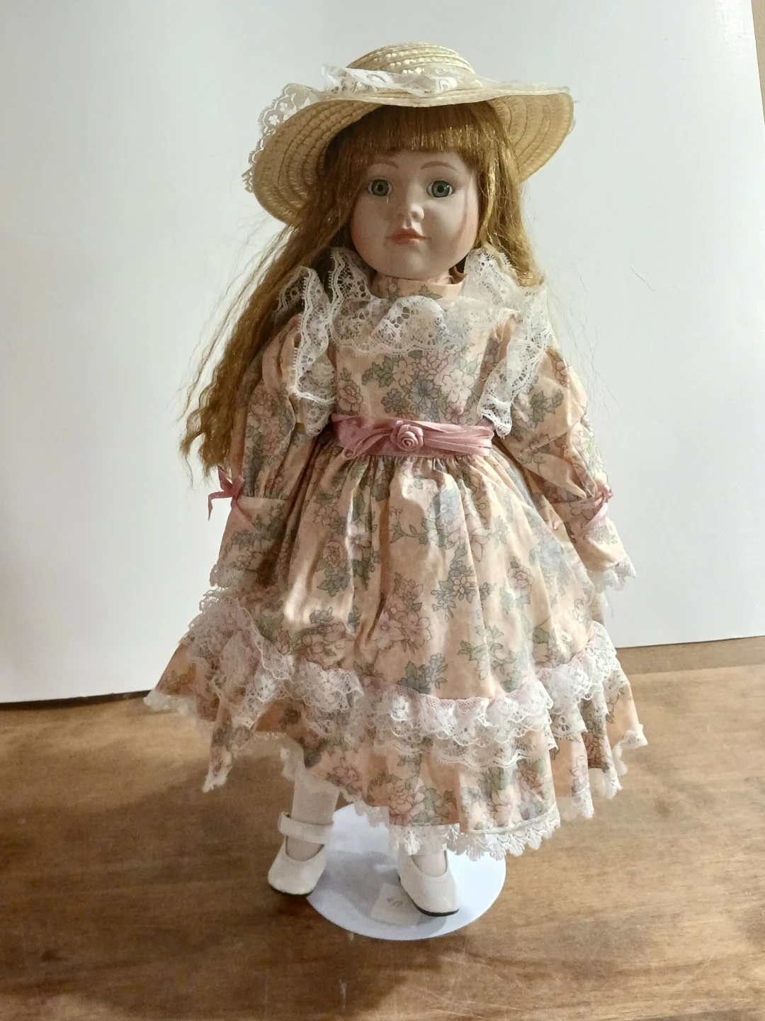 1. 16"H Victoria Porcelain Doll with stand wearing a pink ruffled floral dress with hat $25.00