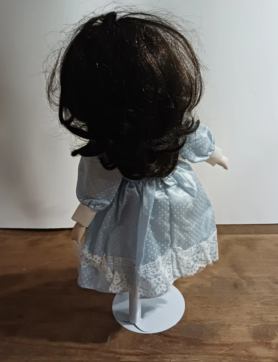 2. 16"H Heritage Collection- she wears a blue ruffled dress with pink flowers and a stand $25.00