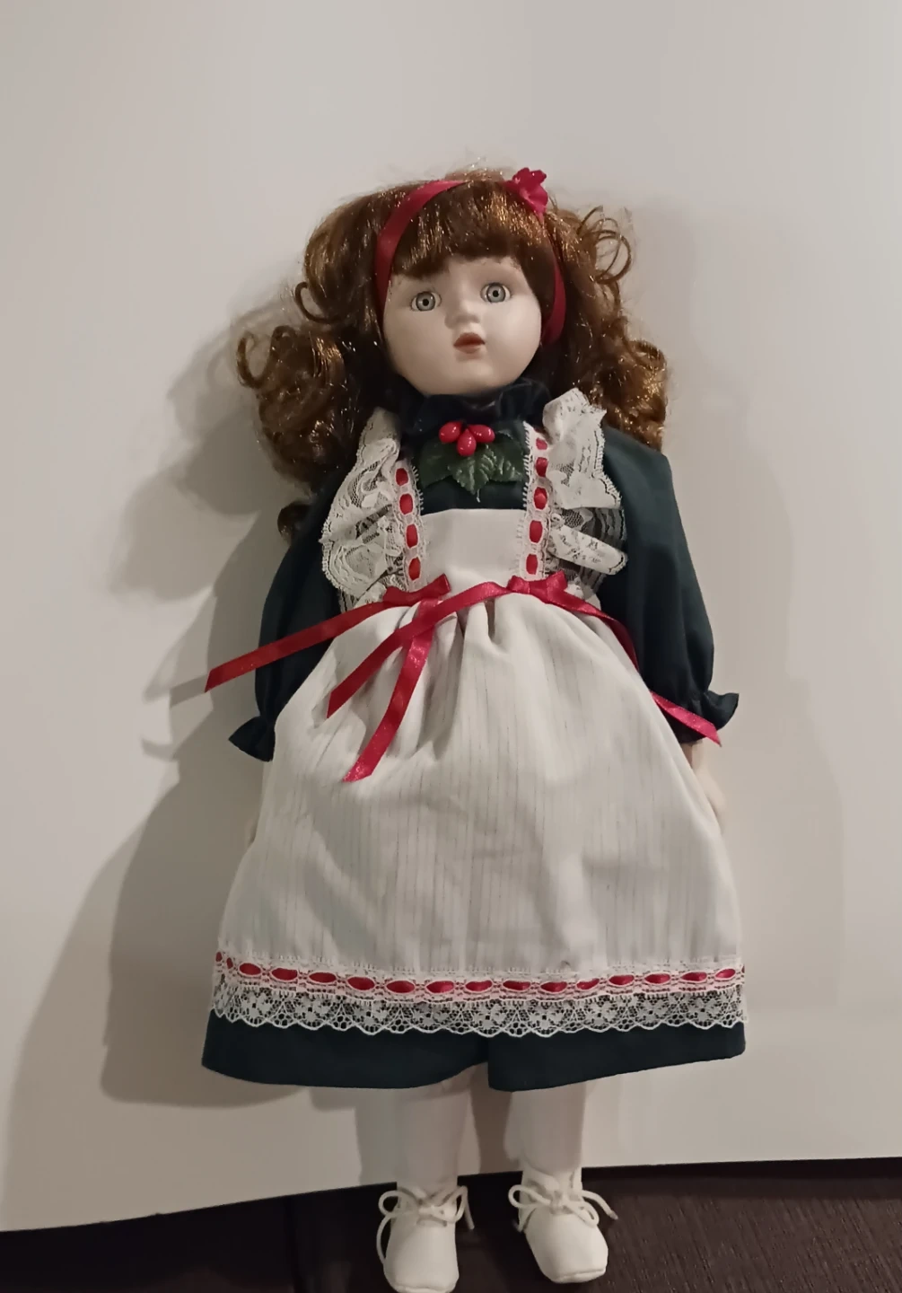 3. 16"H Soft facial expression, green dress with a white petticoat apron and red ribbon , NO stand $15.00