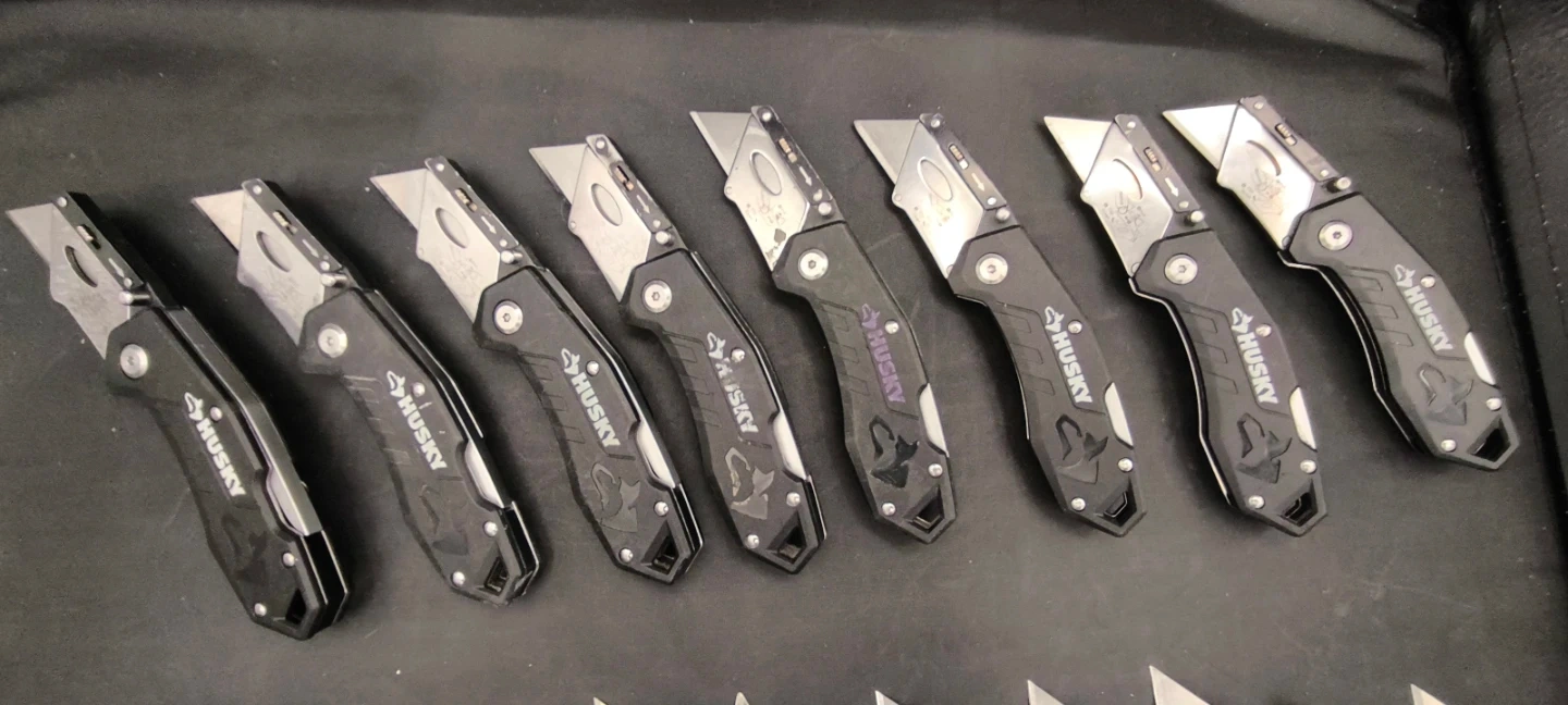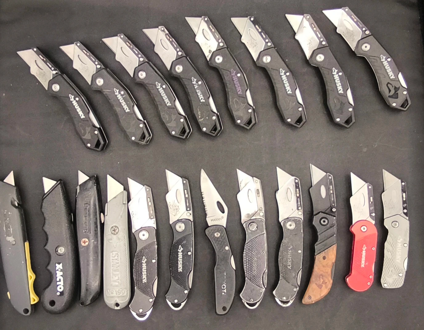Selling a collection of utility knives from various brands like Husky, Stanley, and X-Acto. Great for any DIY projects or professional use!