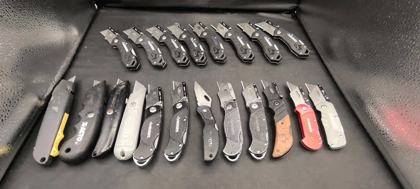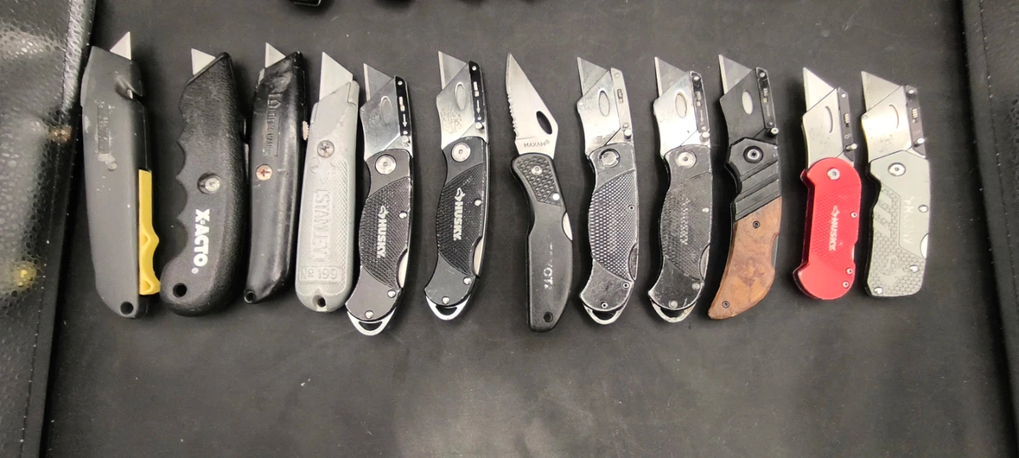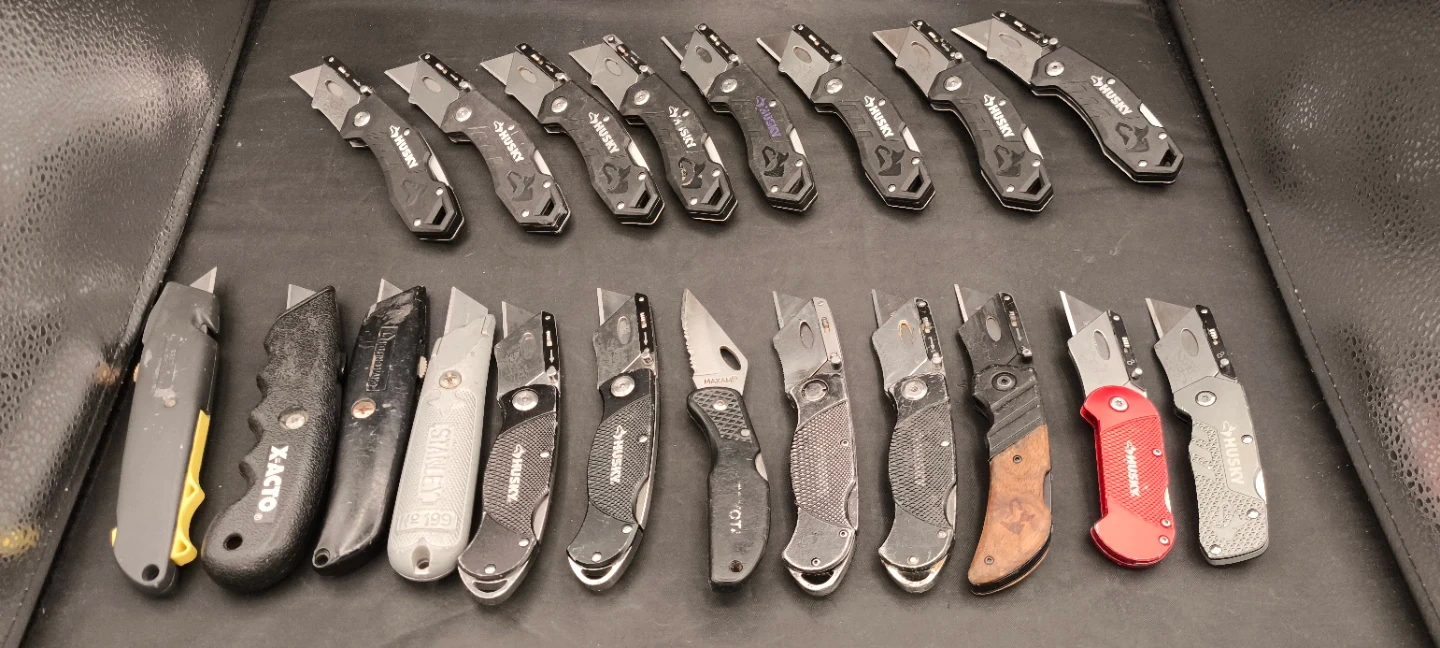 Selling a collection of utility knives from various brands like Husky, Stanley, and X-Acto. Great for any DIY projects or professional use!